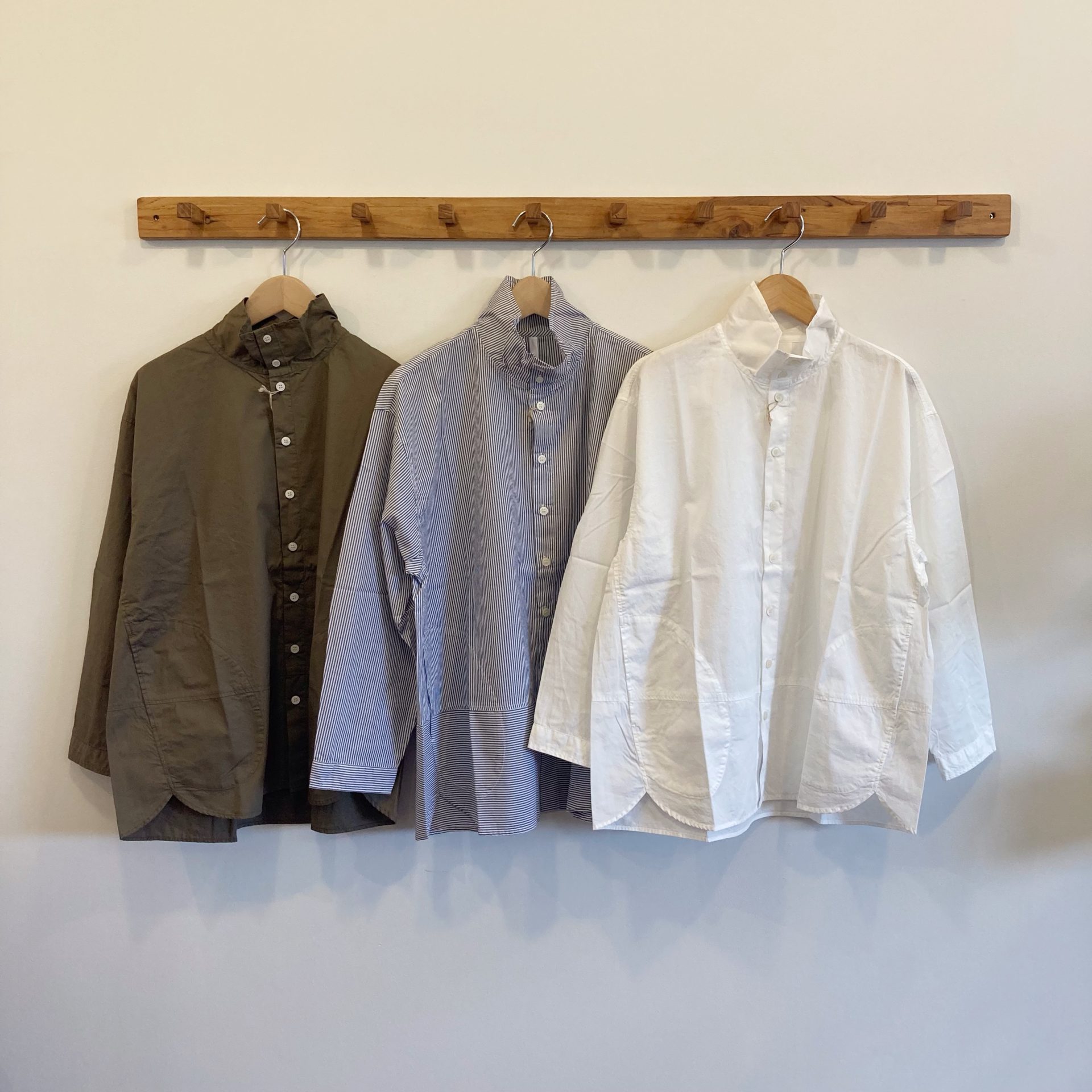 Bico grin ブロードハイカラーシャツ 襟の高さがあるので、日除けにもなるし、前を開けて羽織りにも使えるシャツです♪ 両サイドに大きなポケットが付いています☆ 綿100% 9,900yen 2021-09-09 by chabbit grin < grin grin >