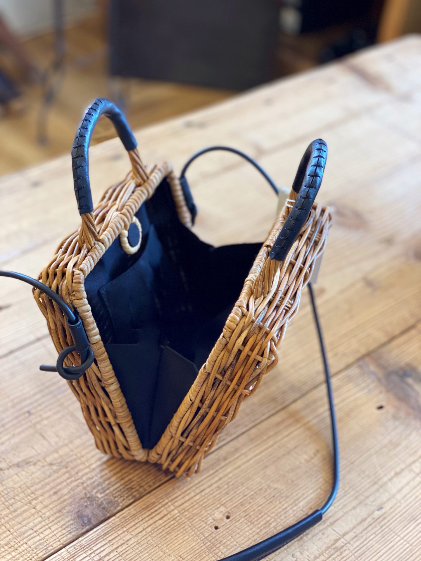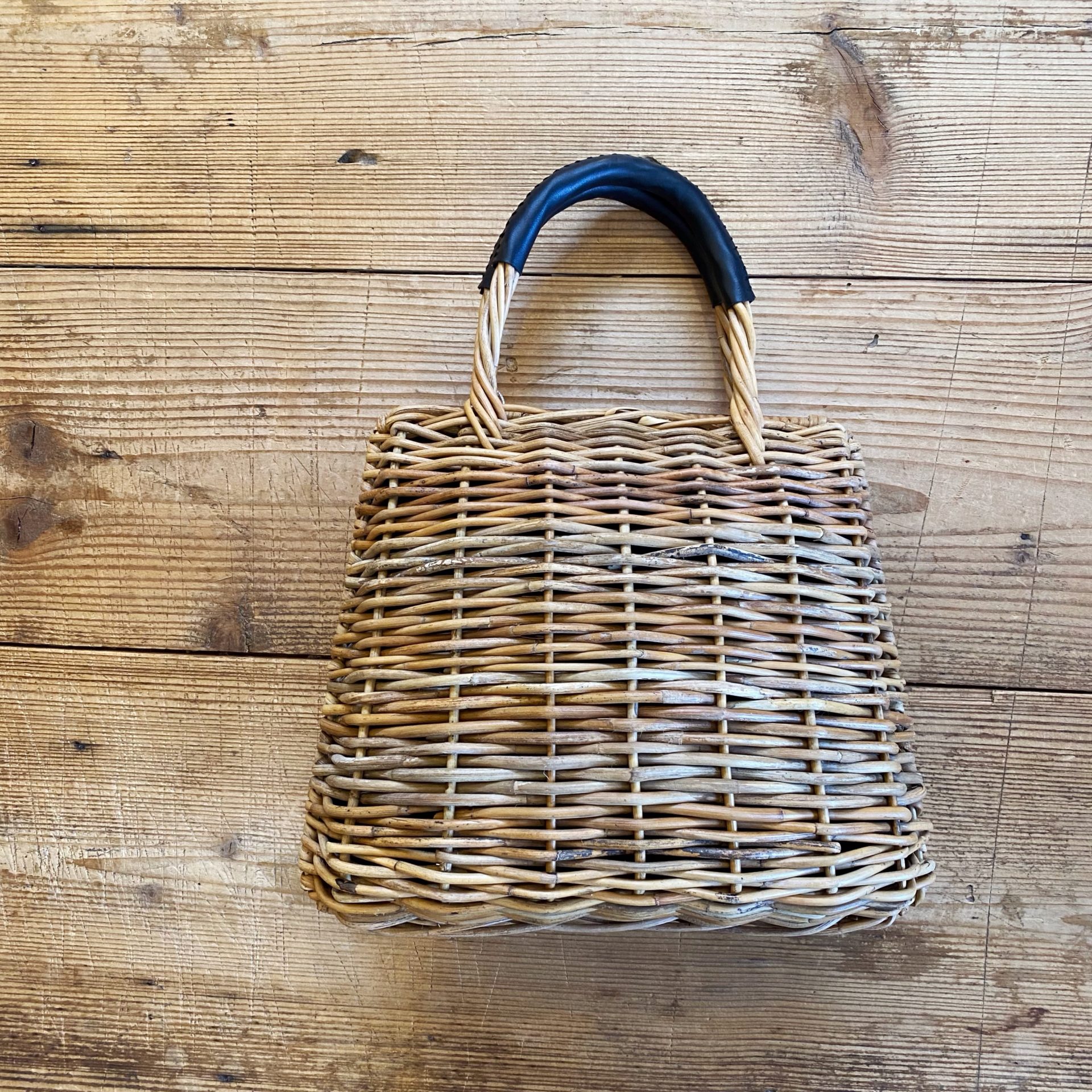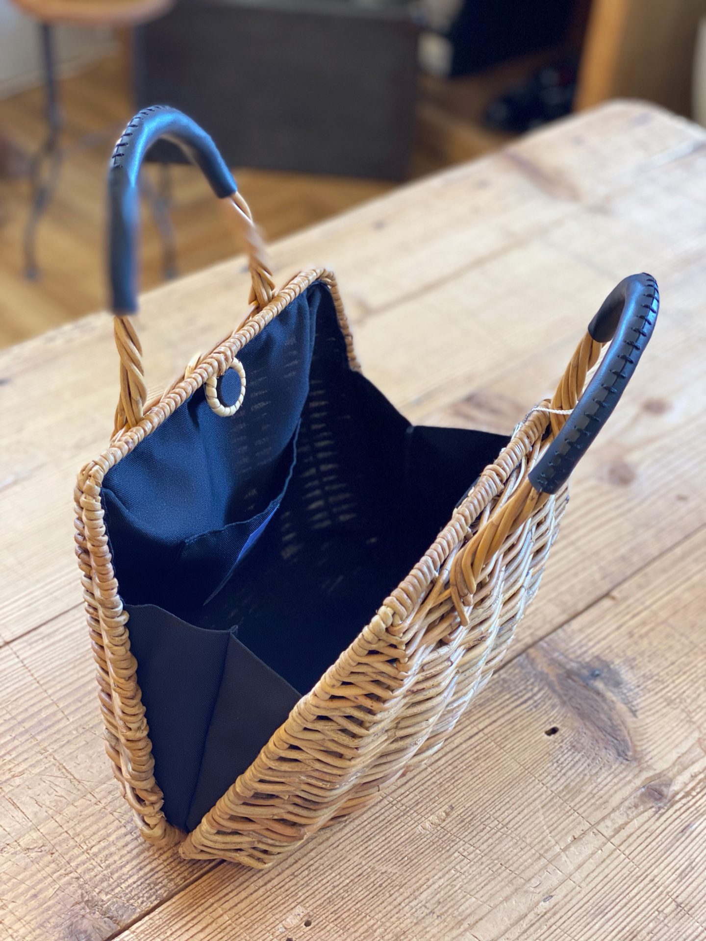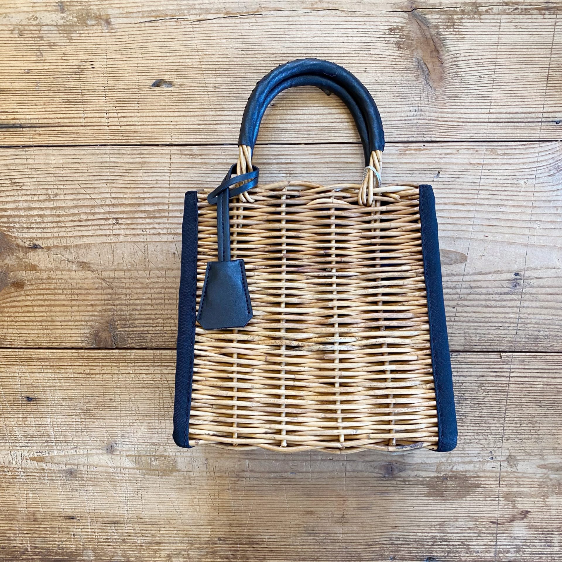 持ち手部分には黒い合皮を使用し、ナチュラルな雰囲気に大人っぽさを加えたバッグです☆