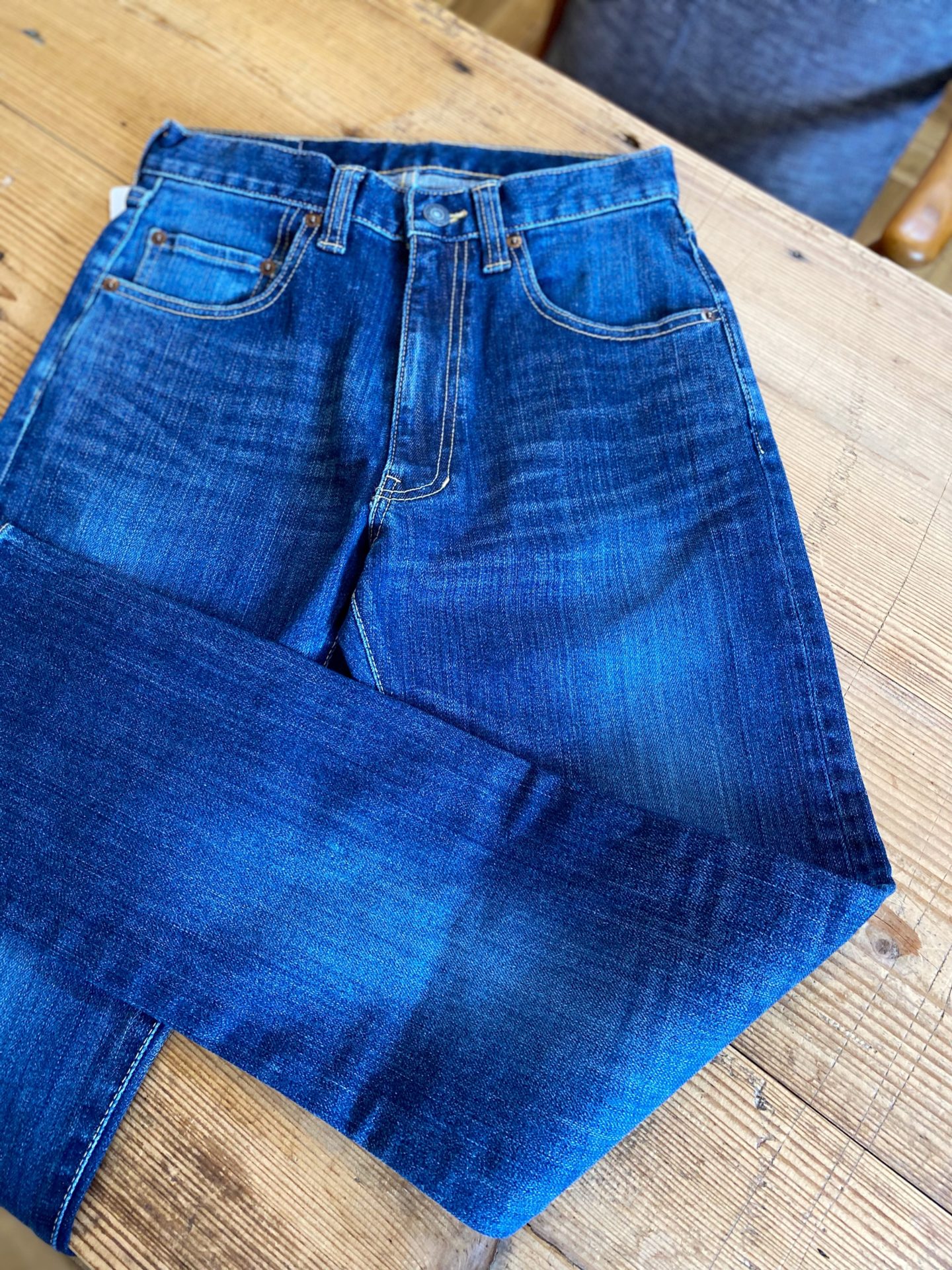 デニム生地を織りたてたそのままの糊のついた状態なので、ハリがあって硬く、経年によって穿いた人の個性が色濃く出るデニムです☆