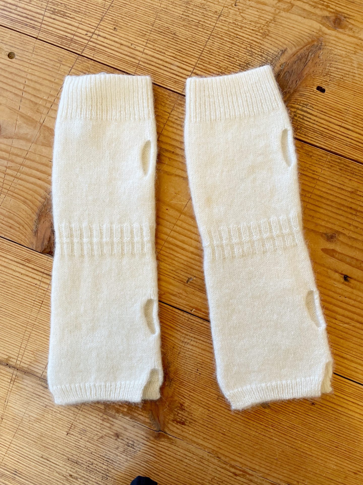 長いまま手首までしっかりと覆う事のできる仕様は上下どちらからでも手を入れられます。真ん中に編み地を切り替えているので 二つ折りの短い手袋としても使用できます♪