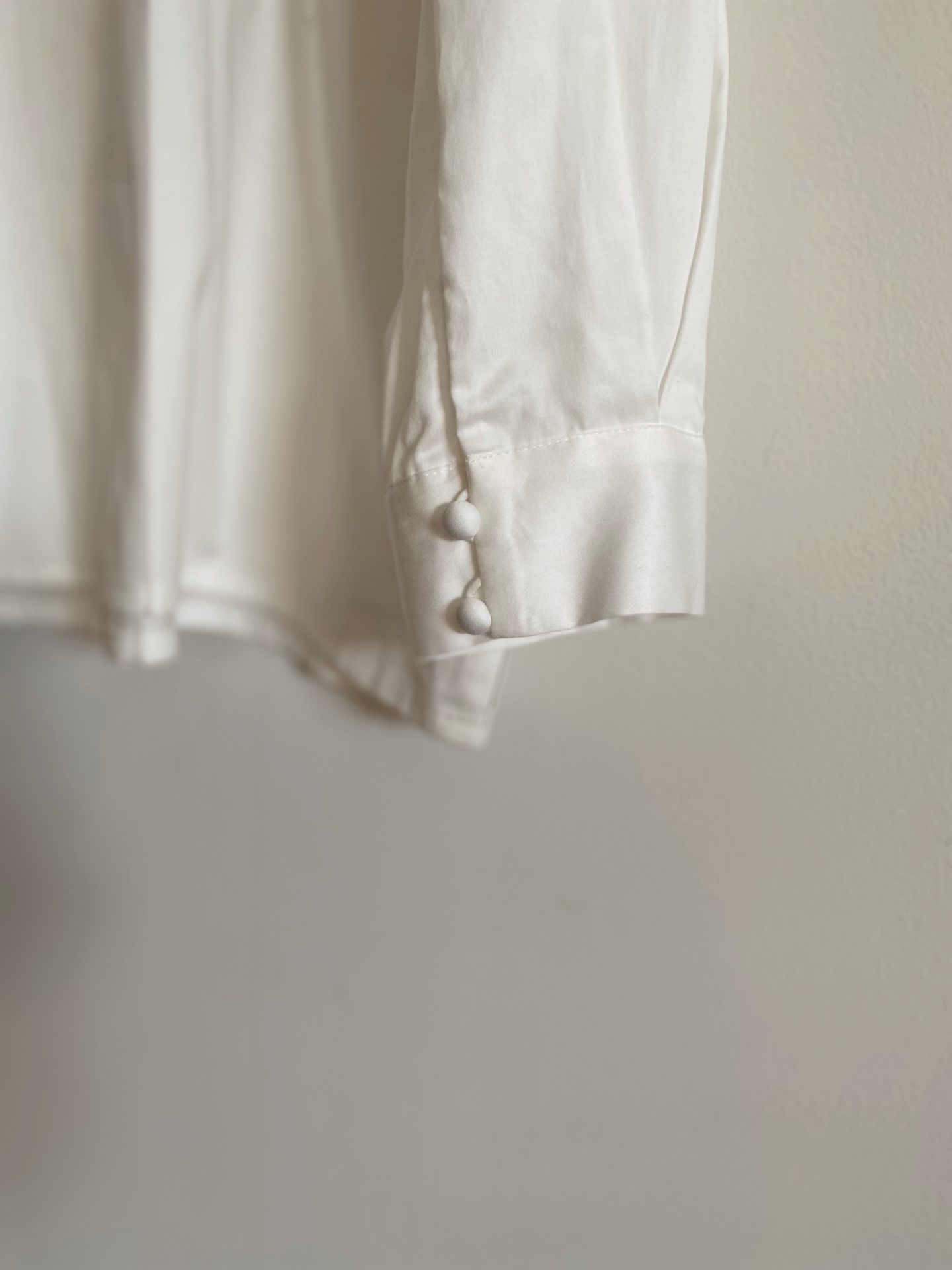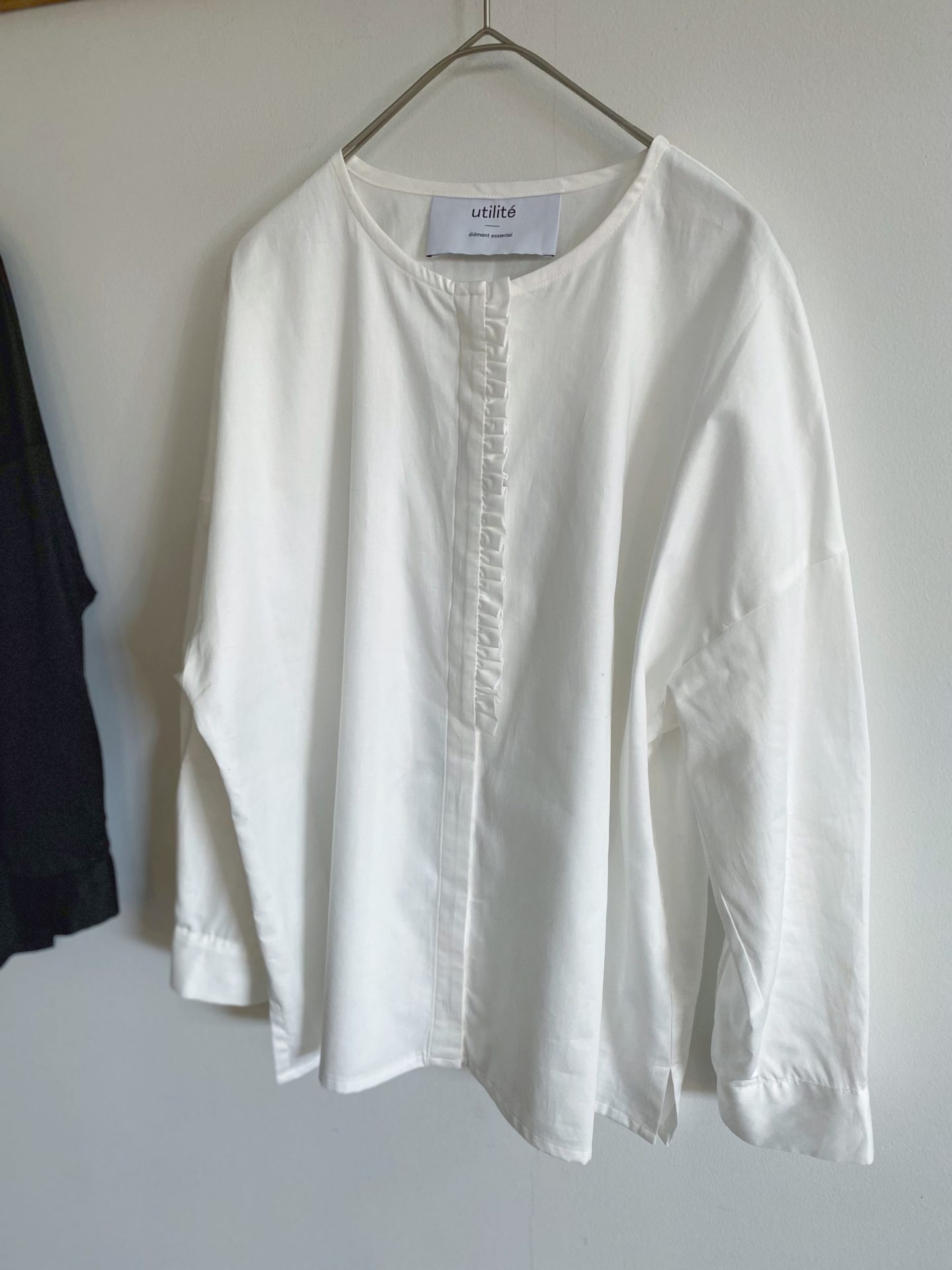 ボタンは比翼で隠し、フリルを引き立たせる仕様に仕上がっていて