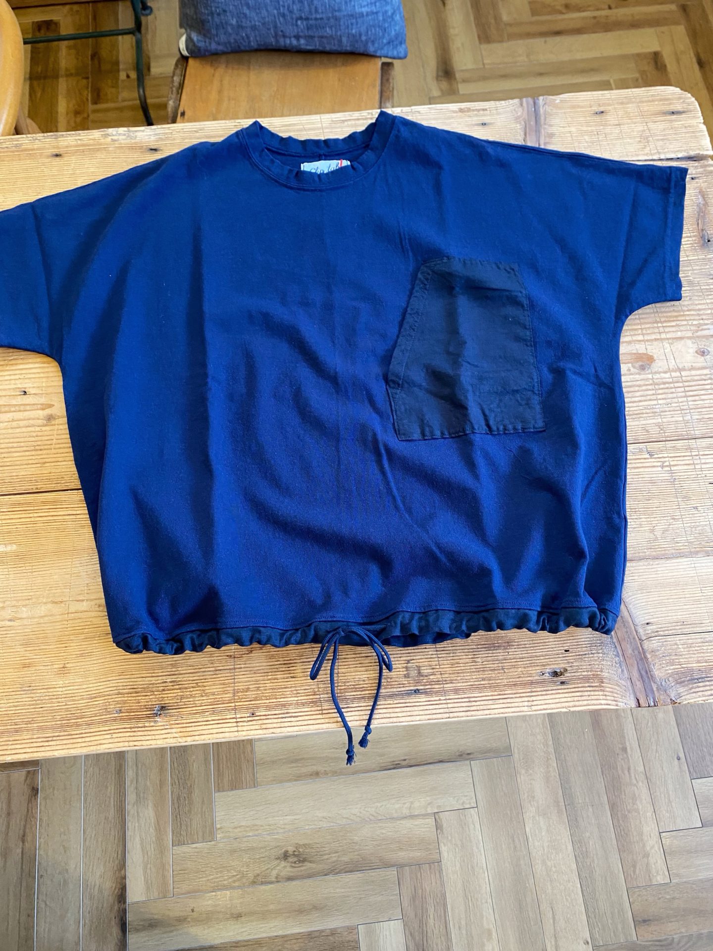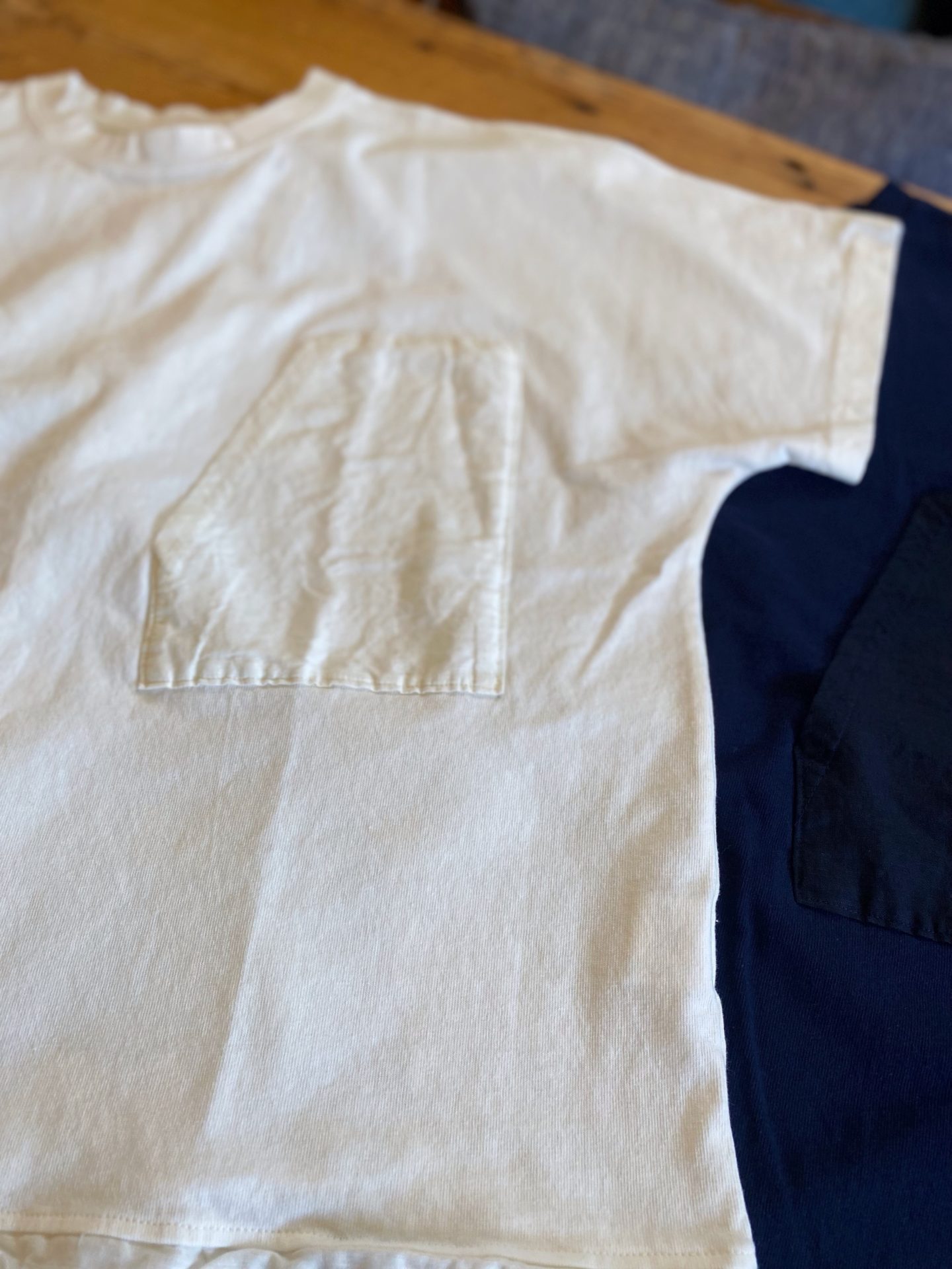 胸元のポケットや裾周りには綿麻の薄手の生地を使用し、異なる生地の組み合わせもポイントです☆