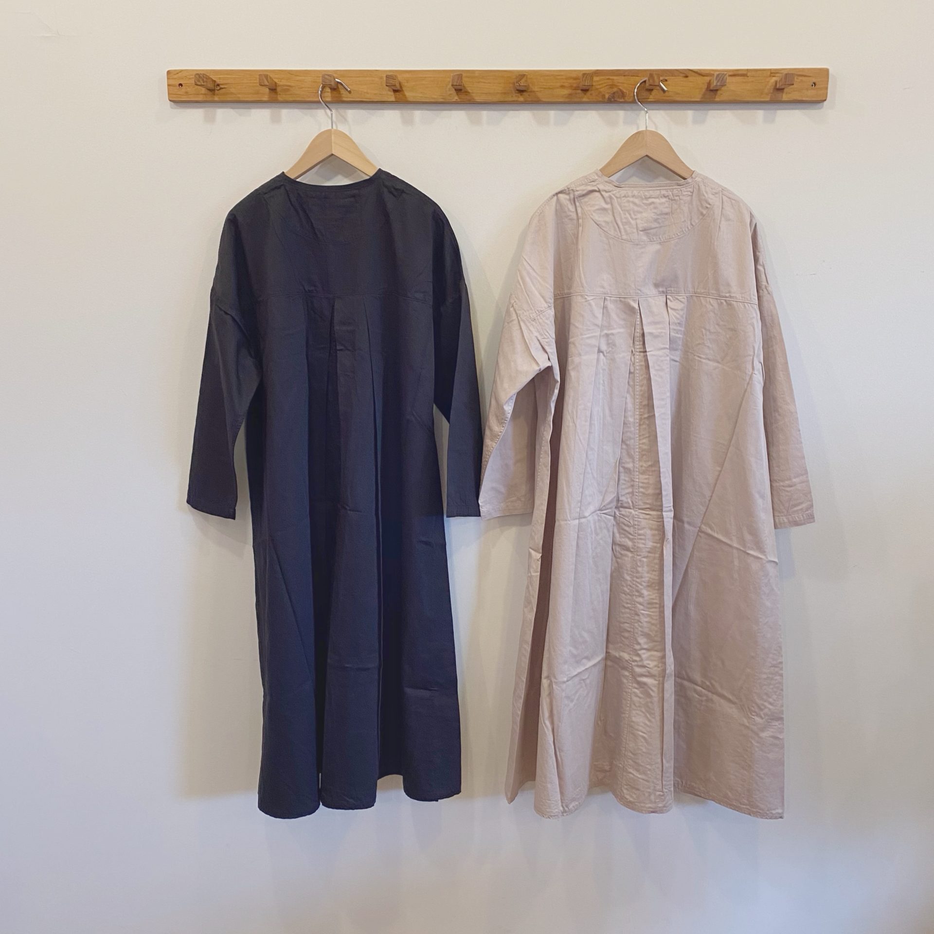 小さな襟とゆったりロングなシルエットが特徴のアトリエローブです♪ ボタンを開ければコートとして、閉じればワンピースとして着回せます。 素材はサテンのシャツ生地で上品な光沢感があり、洗いざらしの風合いはアンティークな雰囲気を出しています!
