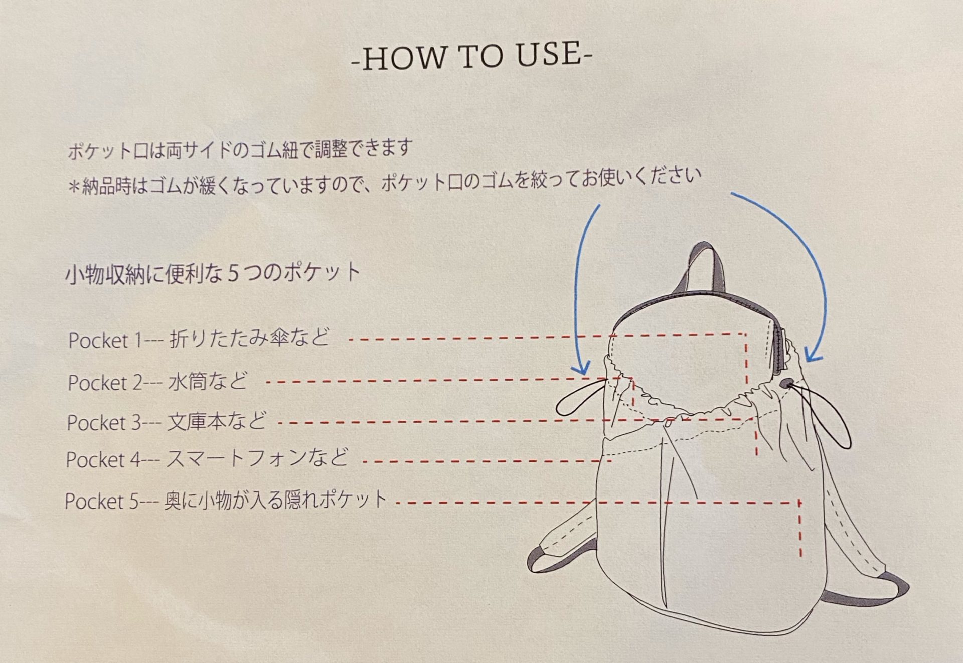 サイドのコードでギャザーを寄せ、幅の調節が可能ですよ!