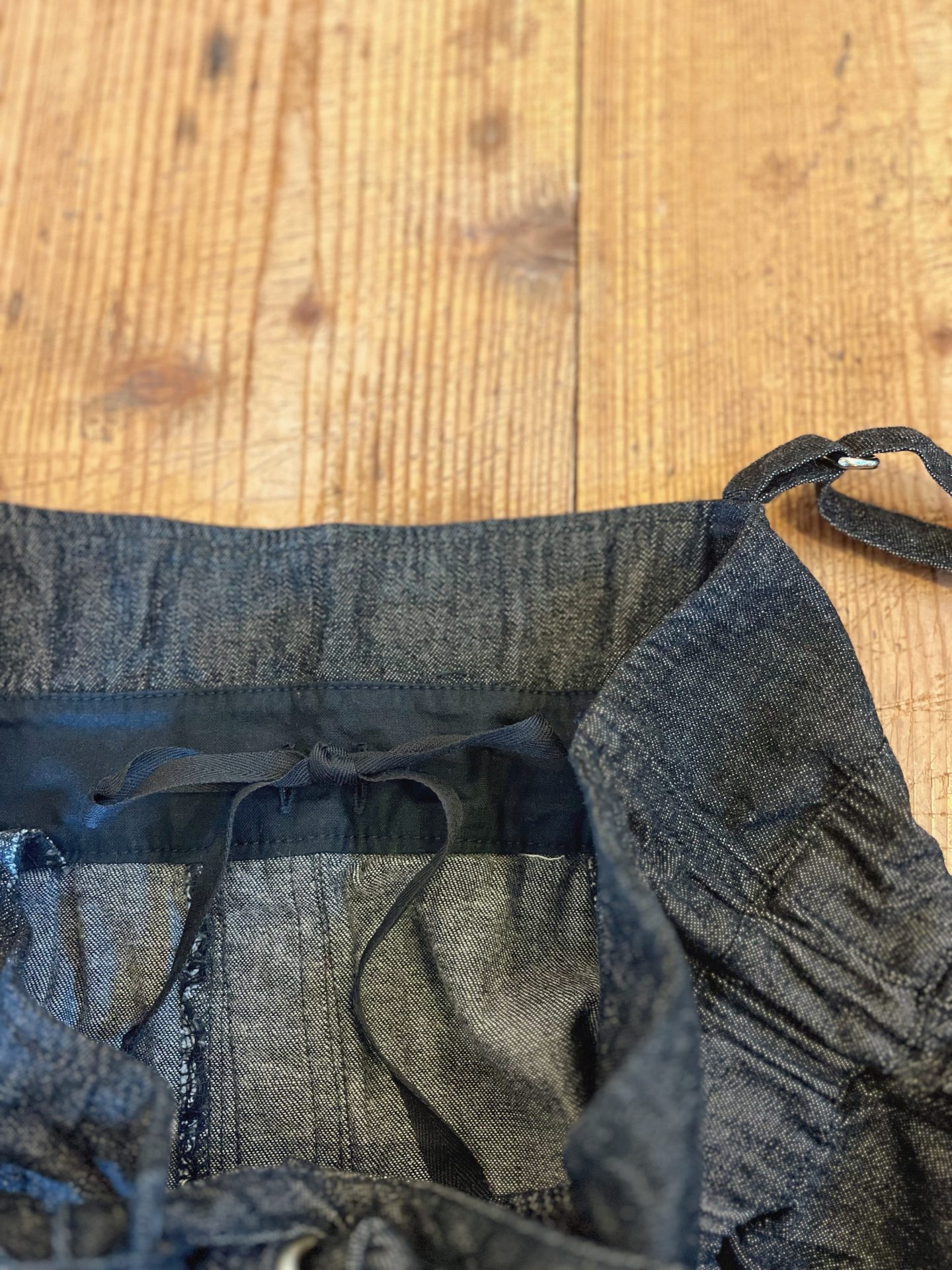 はきこむごとに味わいが増す、やわらかなコットンデニムです!ウエストひもをキュッと絞ると腰まわりが引き締まり、また違った印象になります!脚のラインを拾いにくいワイド幅です♪