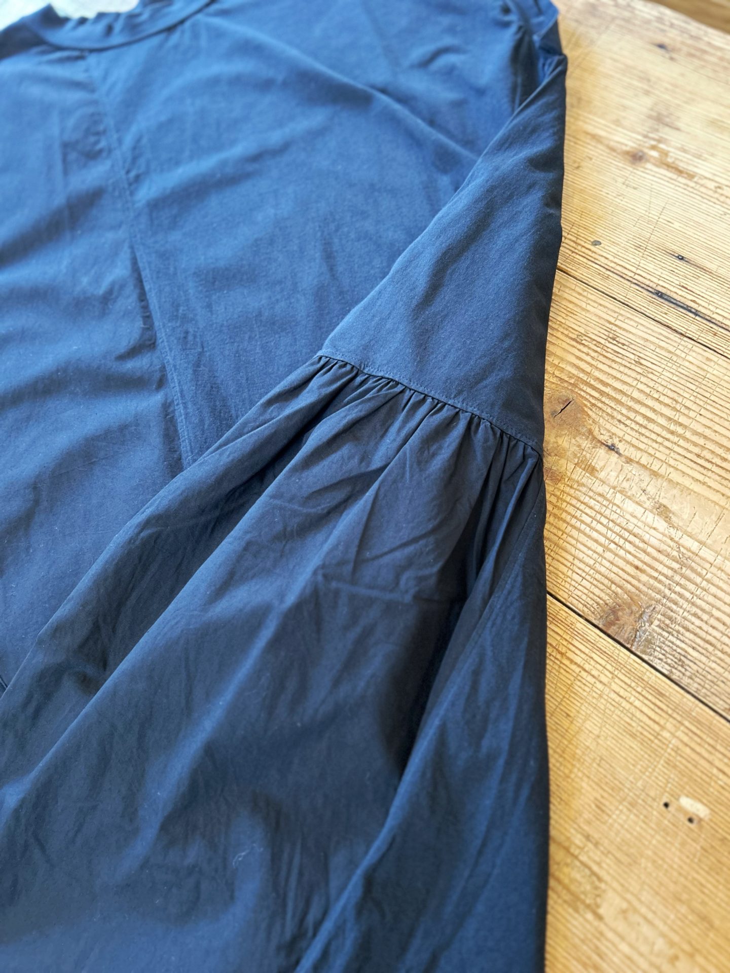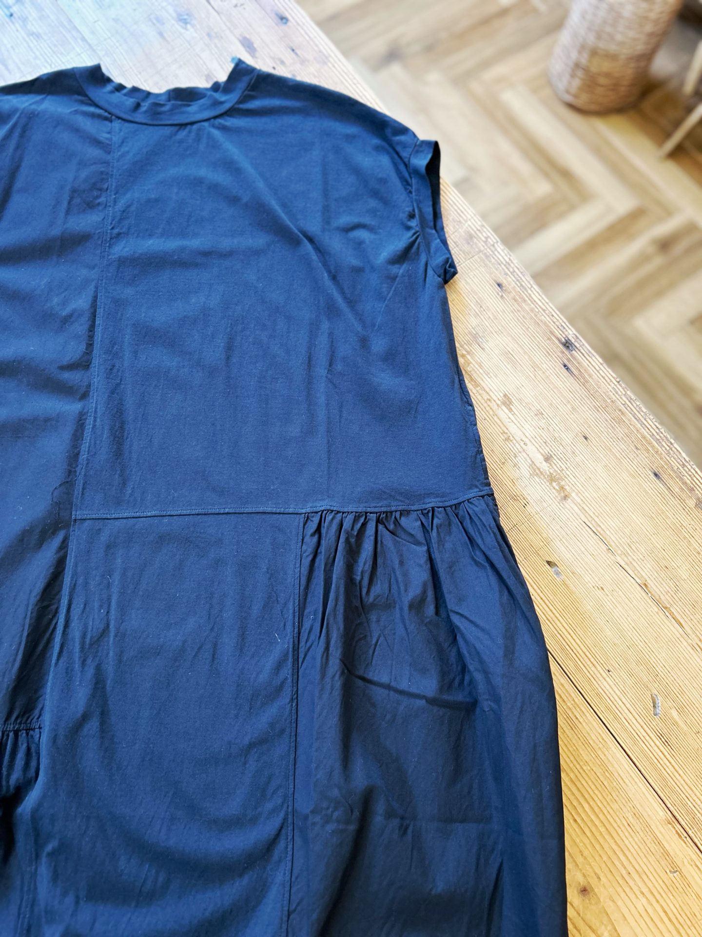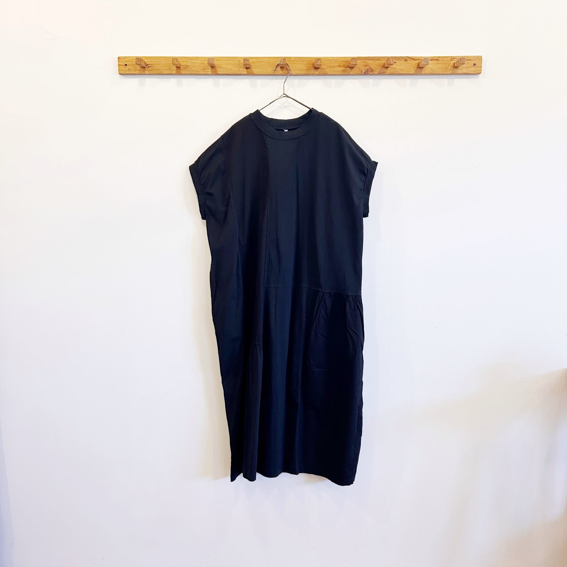 Bico grin エーゲ海ハギハギワンピース BLACK 薄手でハリがあり、肌離れの良い素材で、同系色の生地を継ぎ合わせたパッチワークのような雰囲気のあるボックスシルエットのワンピースです♪ 2024-05-02 by chabbit grin < NATURAL LAUNDRY LILOU + LILY >
