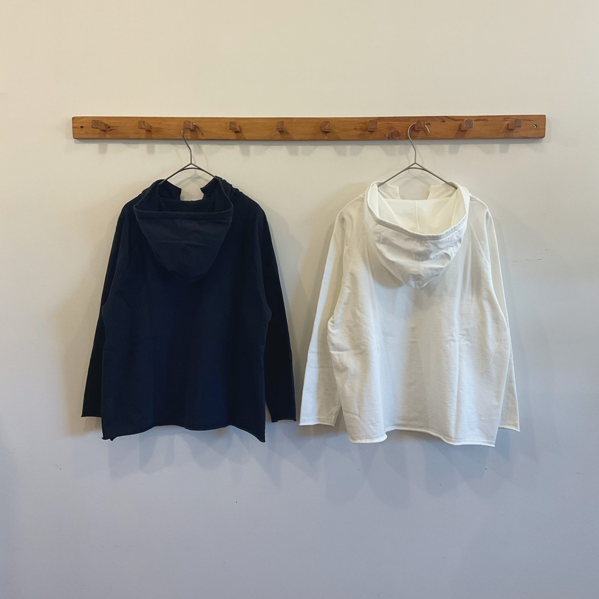 ハイゲージで編み立てられた裏毛生地で、柔らかく肌馴染みの良い素材をさらに水洗いし、着心地の良さを追求しました。通年で着られる生地感でくるっと丸まった袖口や裾、短めの着丈がコーディネートに軽快さをプラスしてくれます!くたっと馴染む襟元とフードのボリューム感がポイントです。