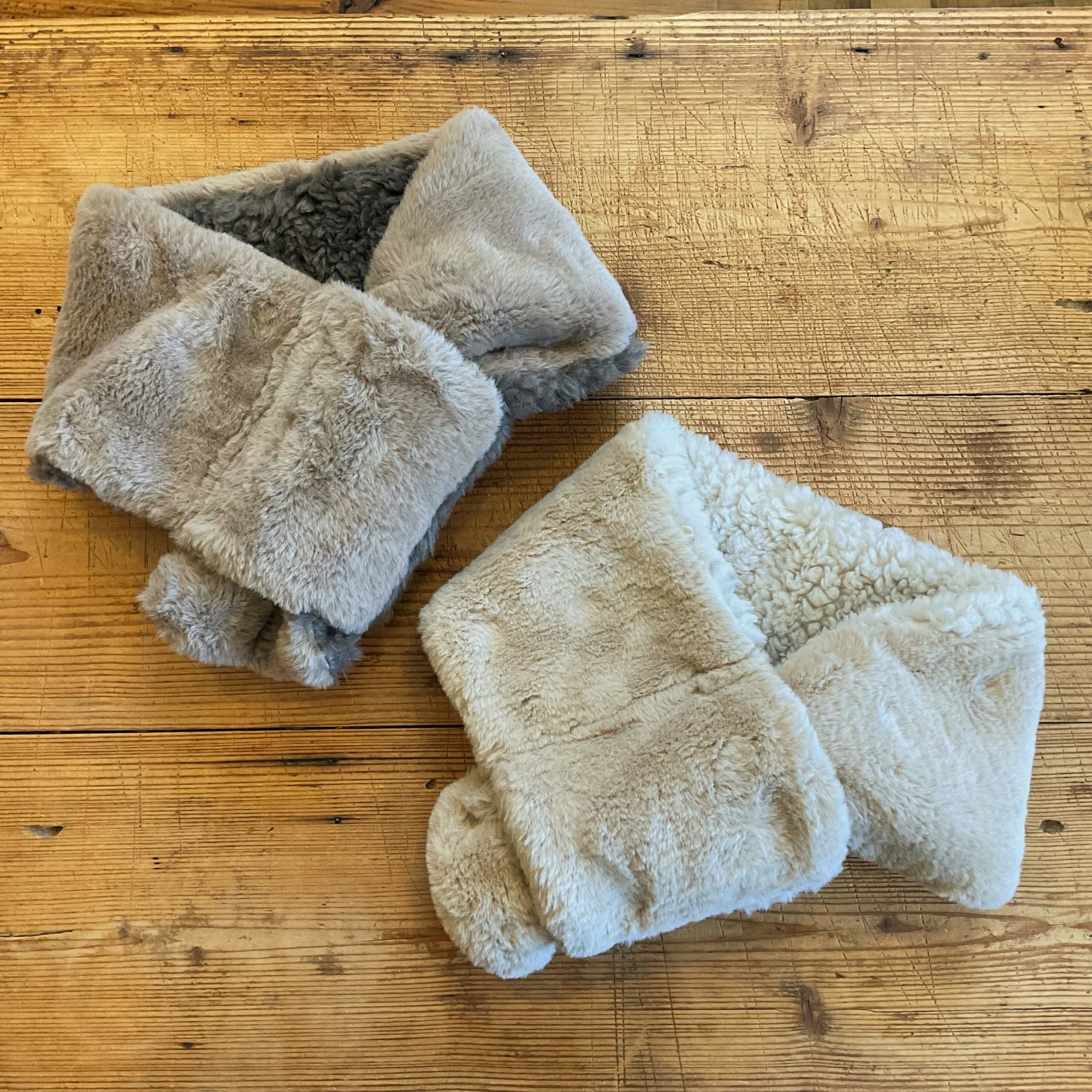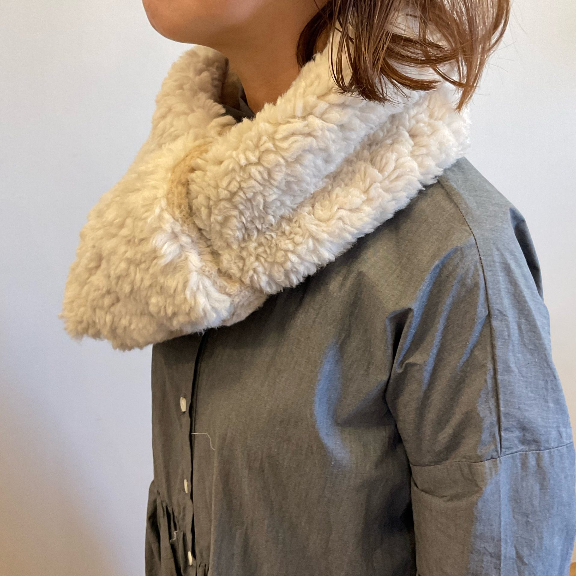 もこもこ毛足の長いカジュアルのボアと、光沢感のある上品なファーを組み合わせたリバーシブルで使えるマフラーです。穴に差し込むだけなので、簡単に綺麗にスタイリングできますよ。