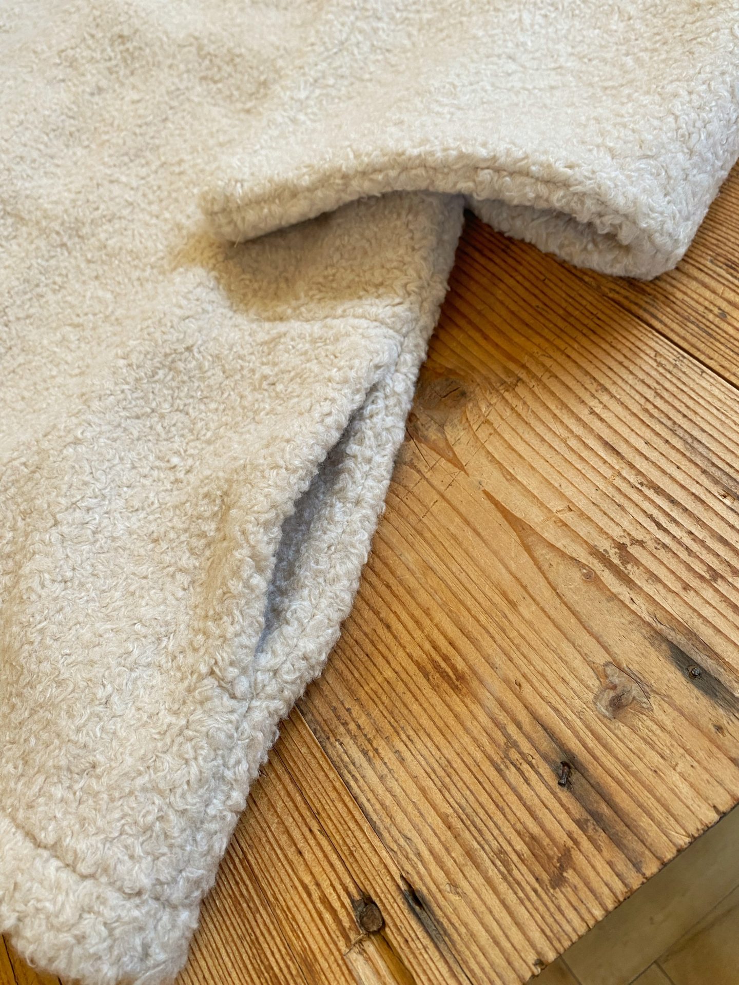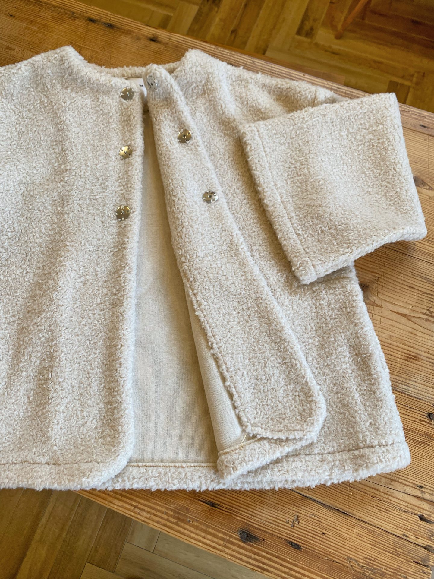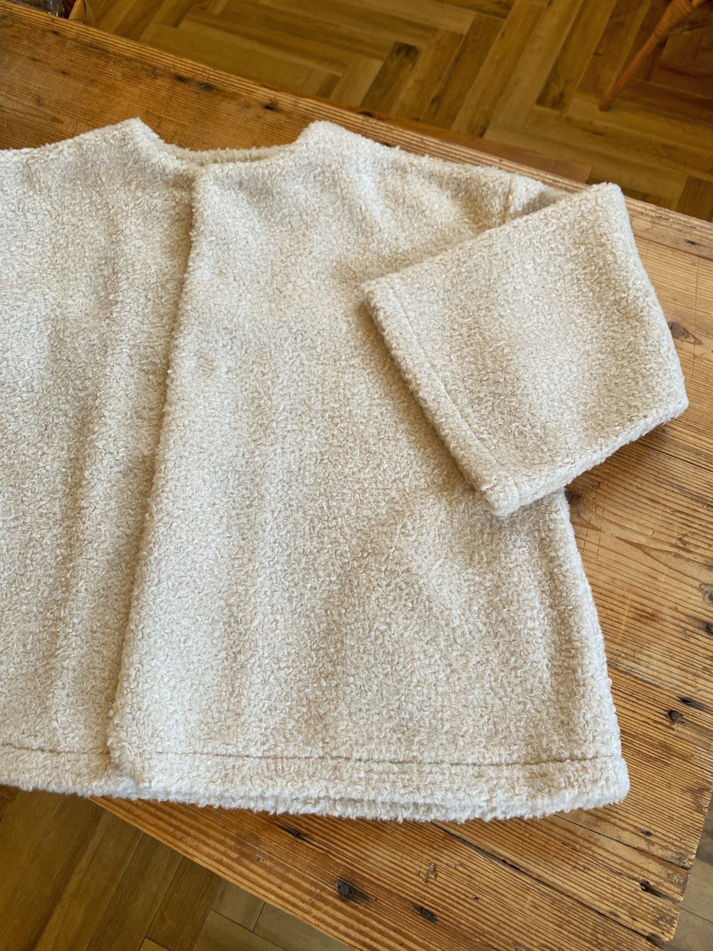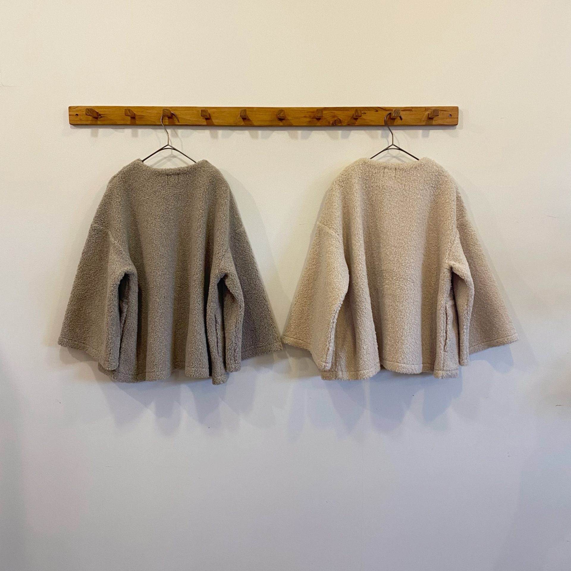 両脇スラッシュポケット、ノーカラー、袖が少しフレアのデザインです!