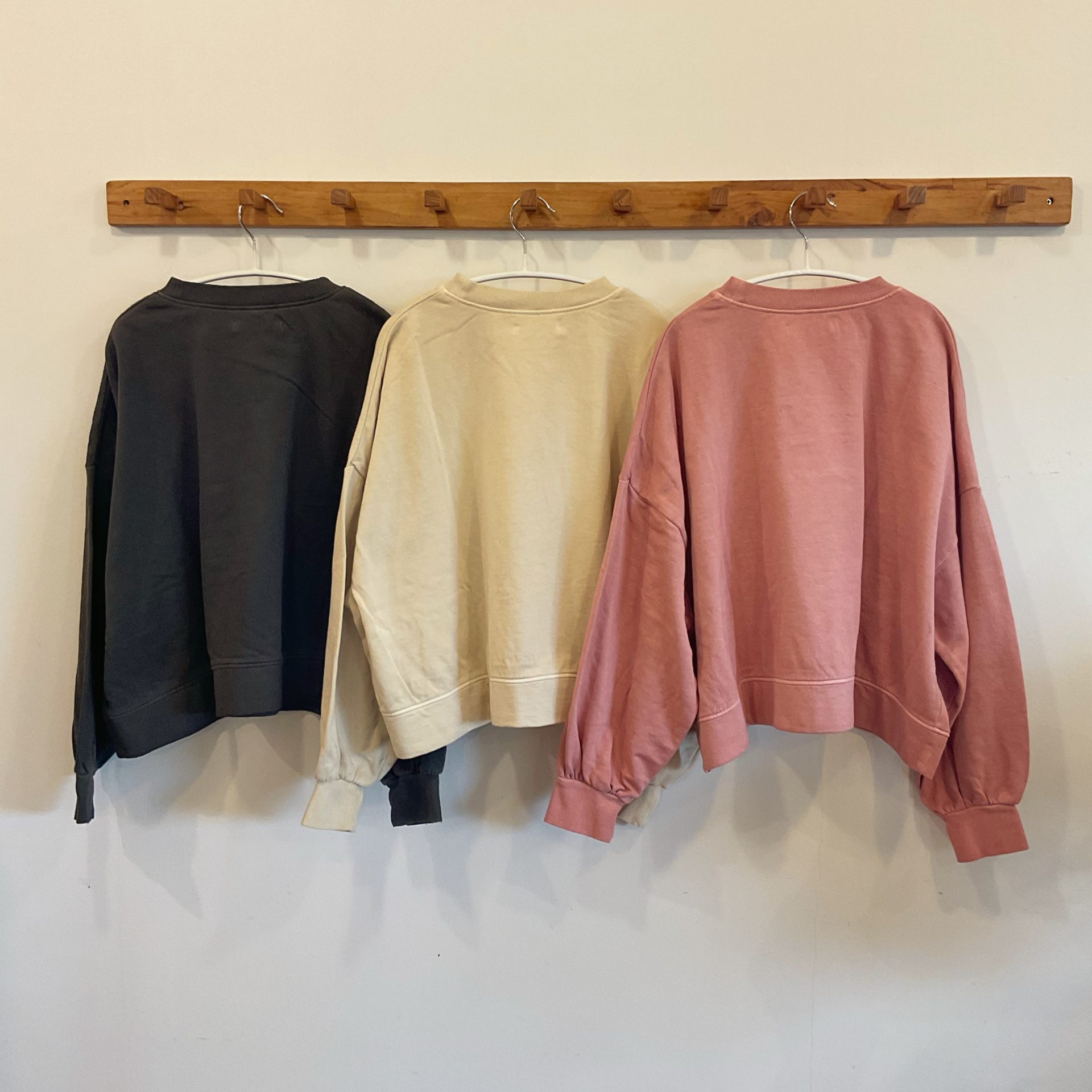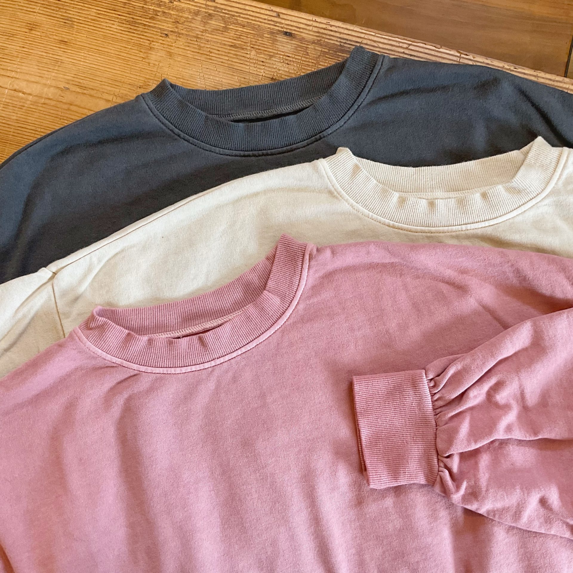 Bico ESTROISLOSE ミニ裏毛クルーネック 古着のような染め加工が施してあるので、シンプルなのに存在感のあるプルオーバーです。 コットン100% 14080yen 少しパフスリーブでゆるっとしたシルエットです。 2024-10-31 by chabbit ESTROISLOSE < ESTROISLOSE NOUVELLES DU PARADISE >