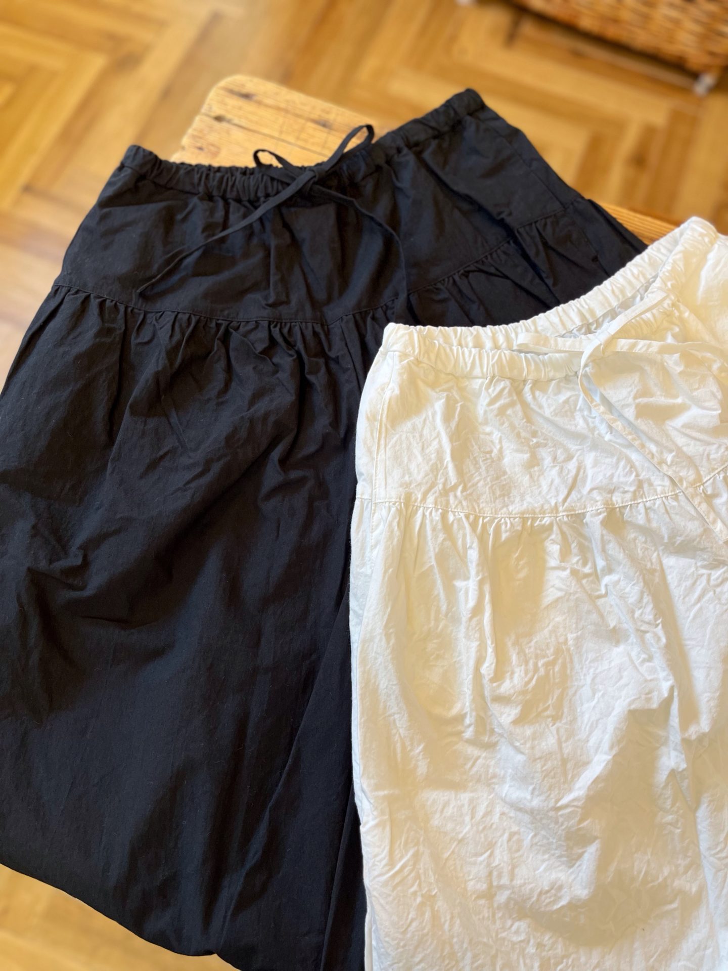 ウエストはゴムと紐仕様で楽に履けますが、ヒップの切替からギャザーが入っていて女性らしさもあるシルエットですよ。