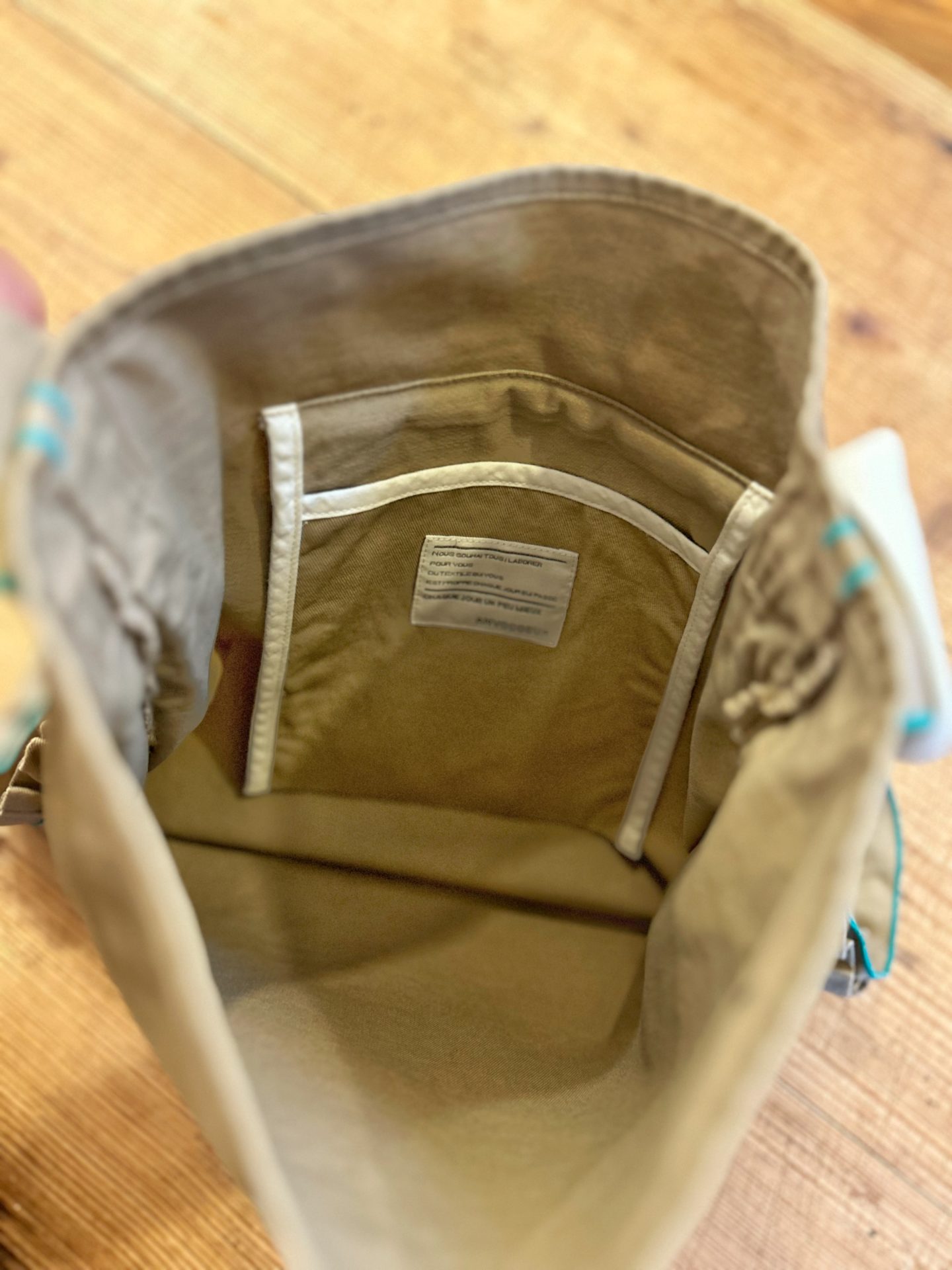 全体に施したメローステッチとギャザーがポイントのトートバッグです。