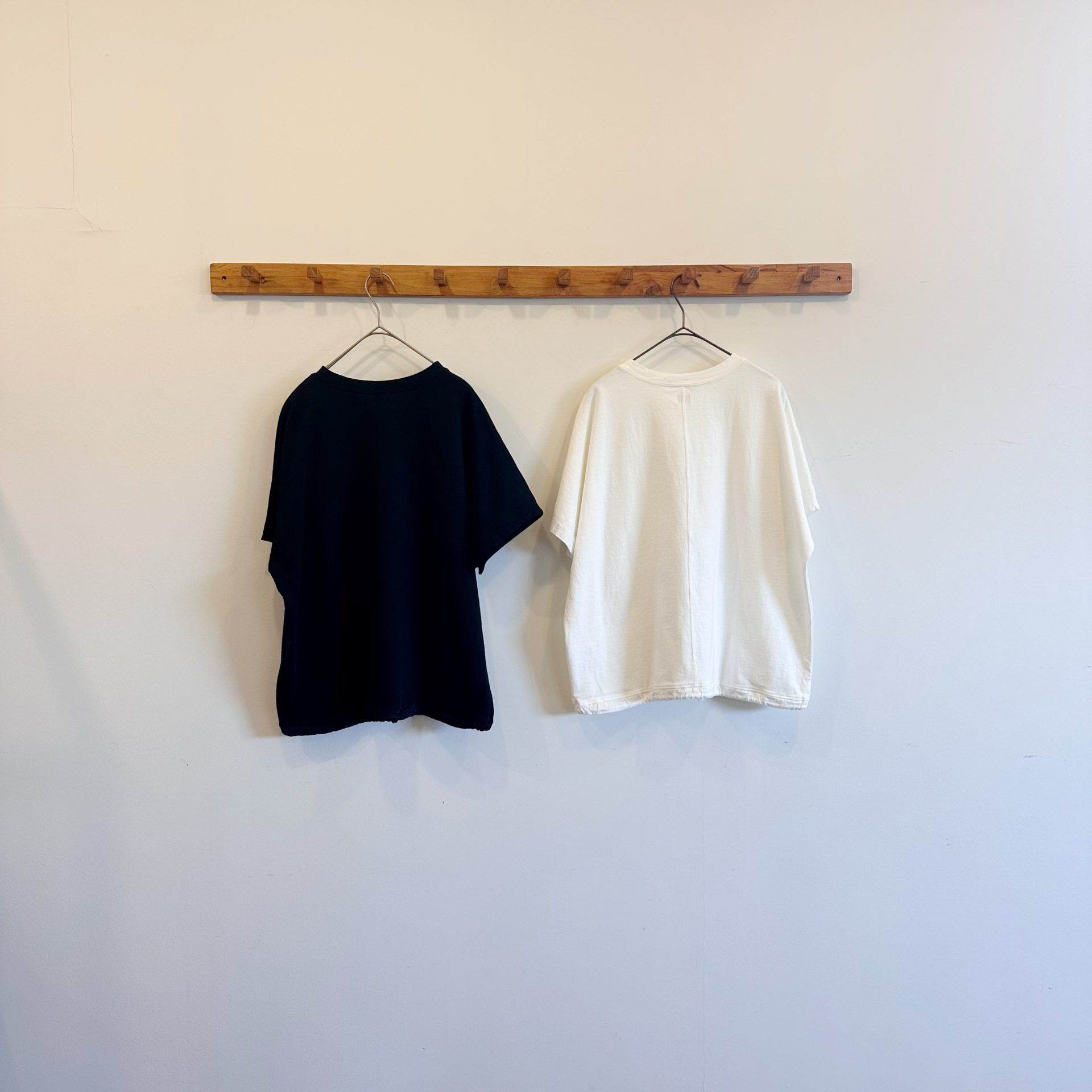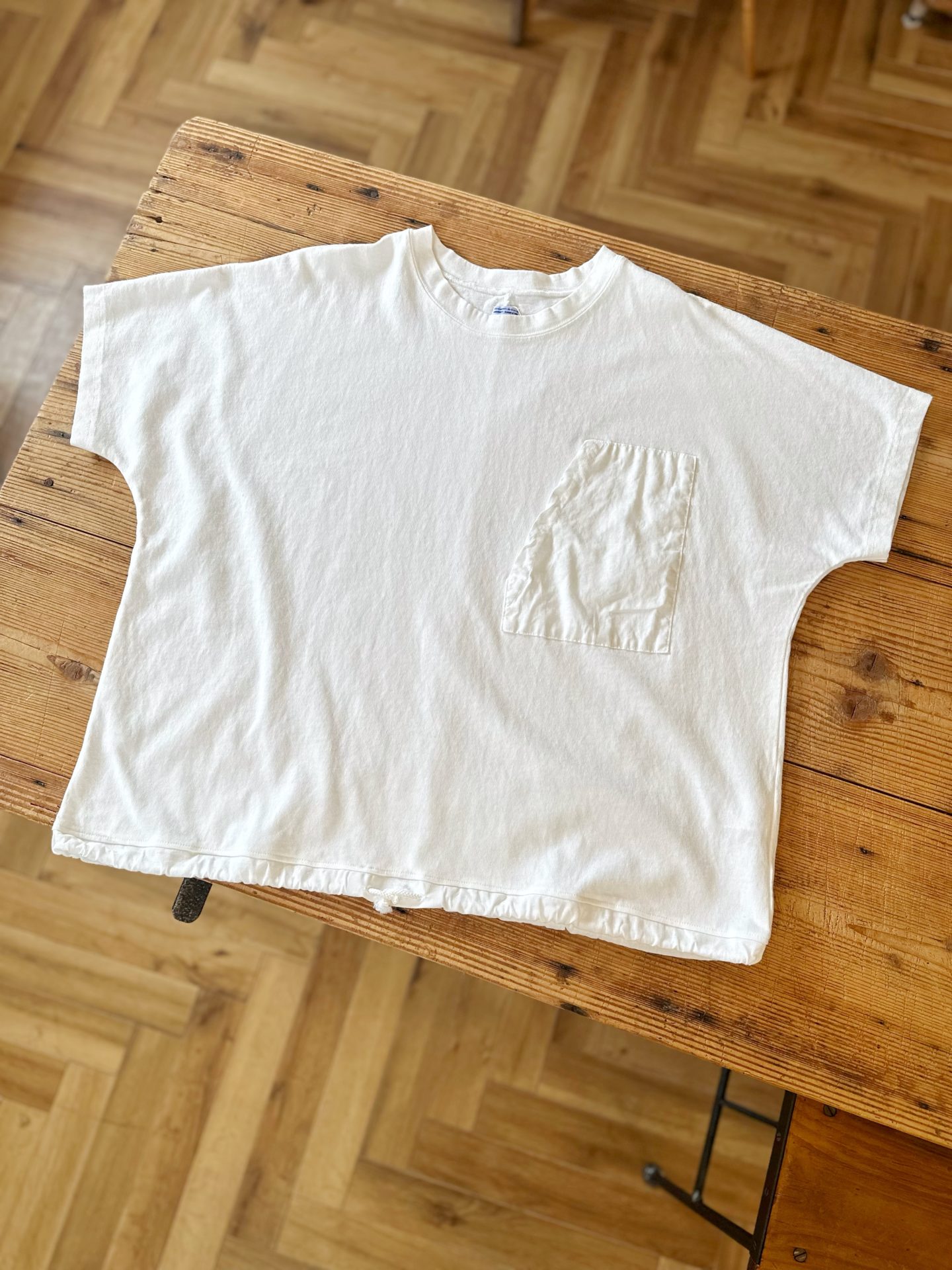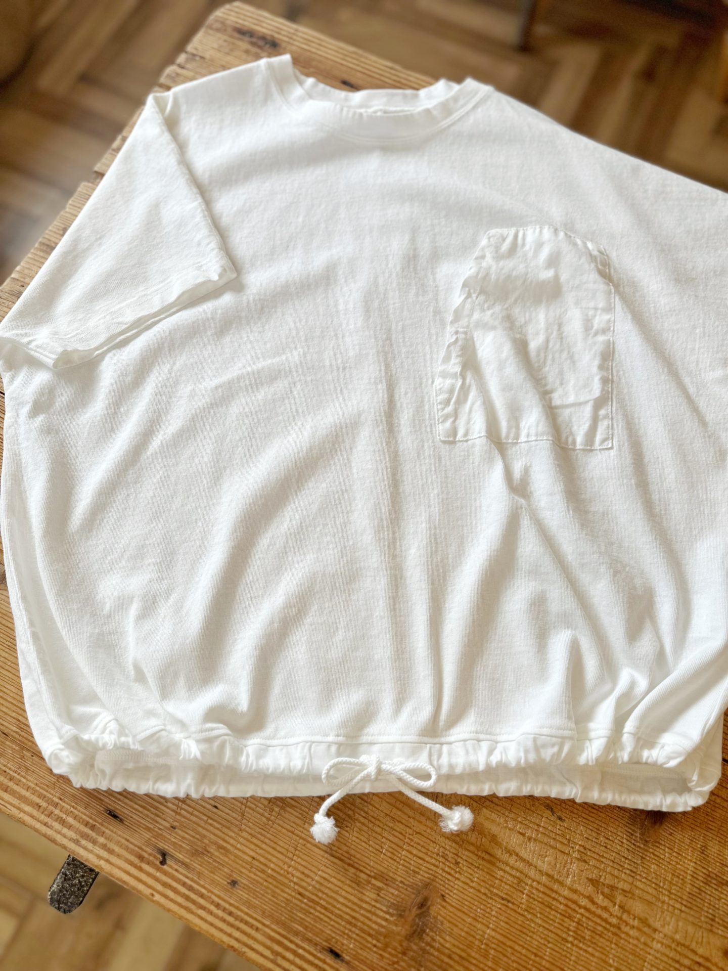 しっかりとした厚みのある生地で、裾幅は前身頃下の紐で調整できます!