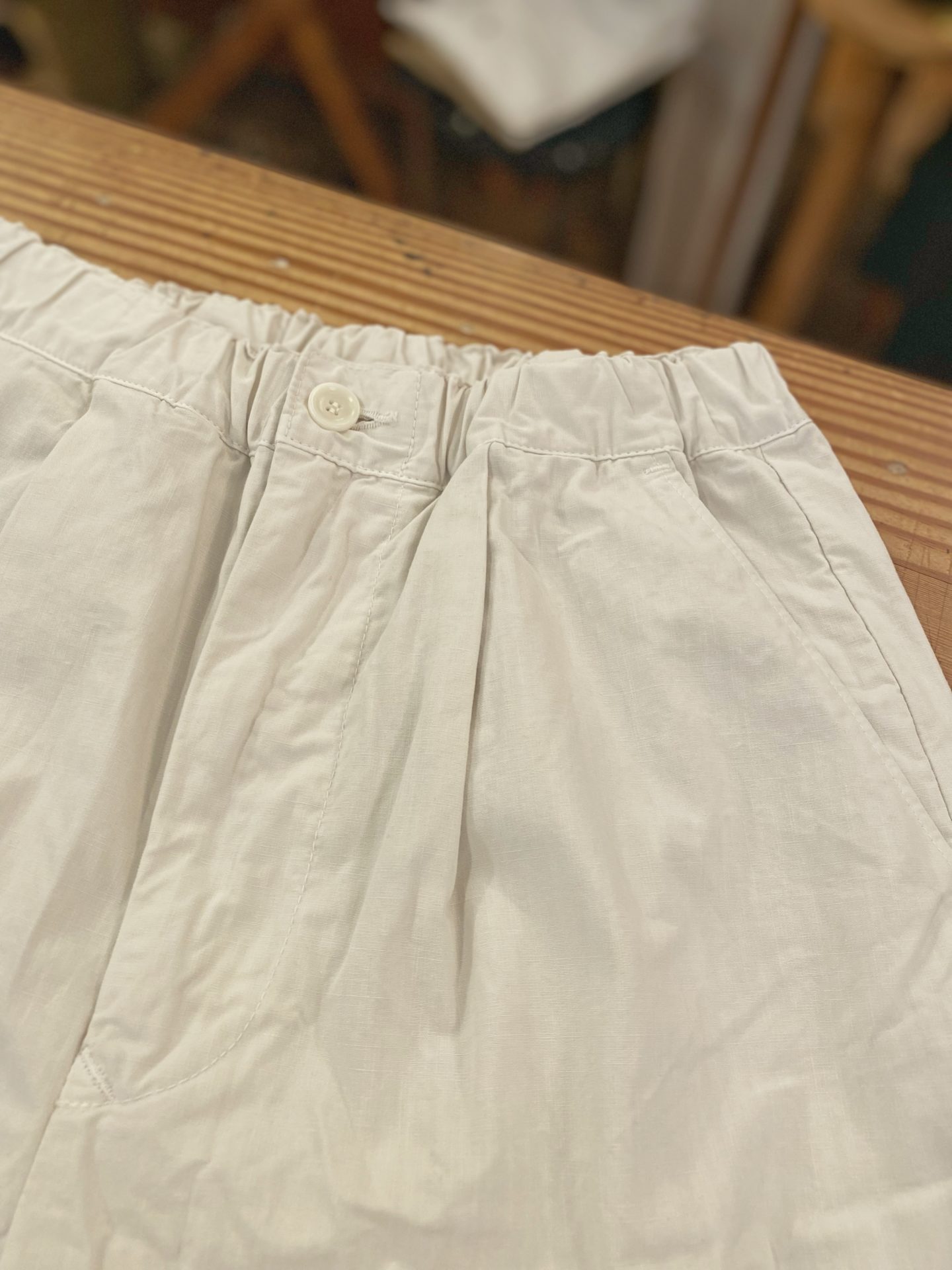 ウエストのタックで程よいボリュームを持たせて裾を絞りバルーンの様な型が可愛いパンツです。ウエストはタック入りでゆったり感があり、釦ファスナーできっちり感を持たせつつゴムと紐も通っていて調整可能なので動きやすいです♪