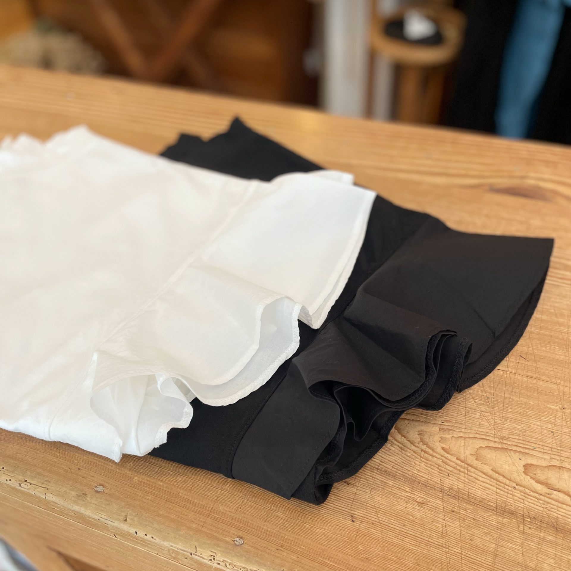 ボディーは柔らかな天竺生地、フリルには綿の薄手の布帛生地を使い、軽やかな透け感です☆