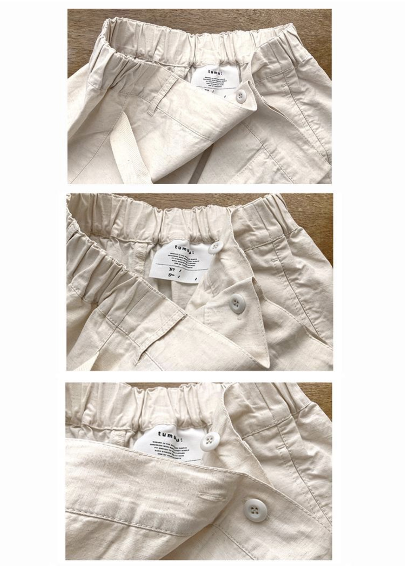ウェストは内側の釦で2段階調整可能、後ろはゴム仕様で楽な穿き心地です。