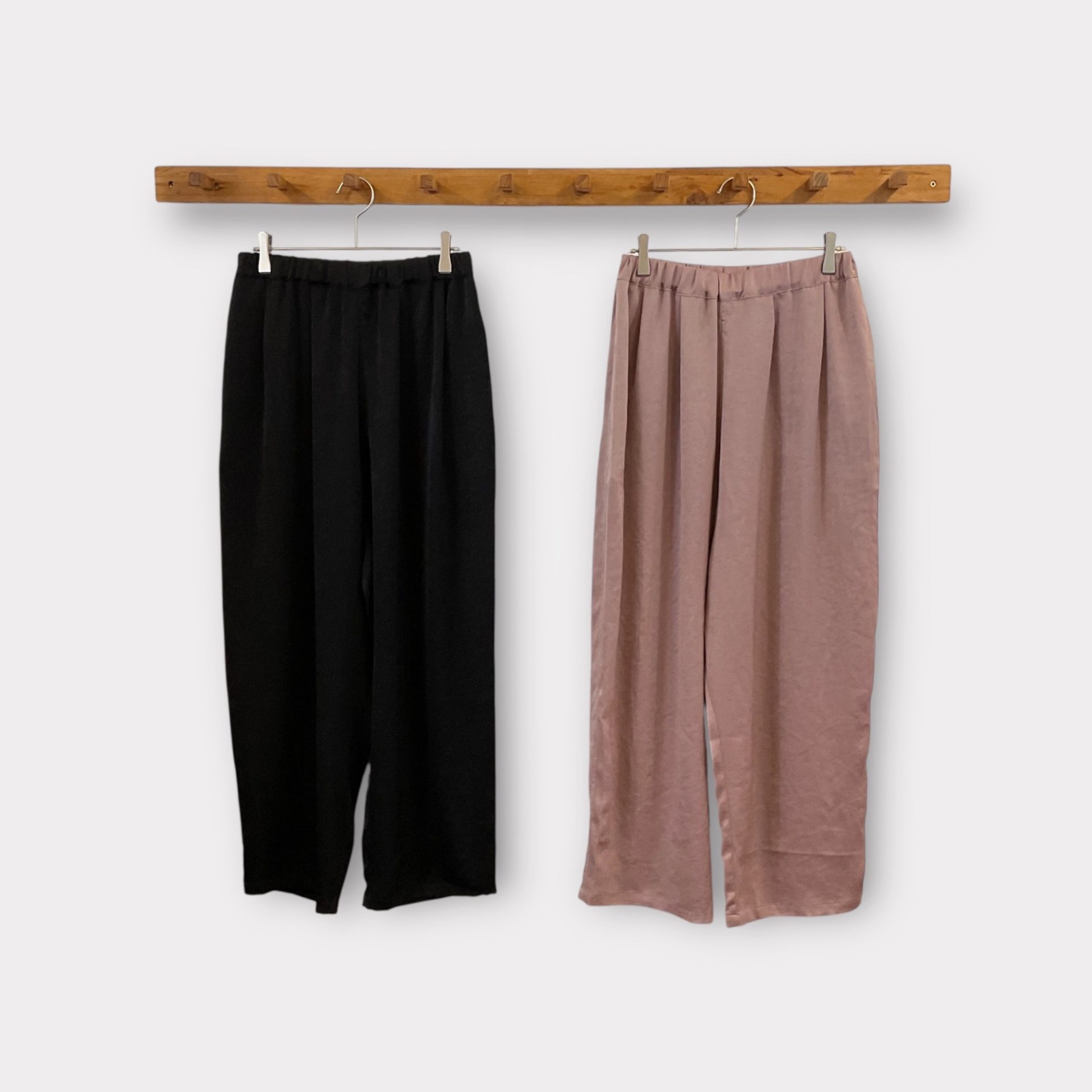 ウエストに2本タックが入っていて太もも周りはゆったりしています。