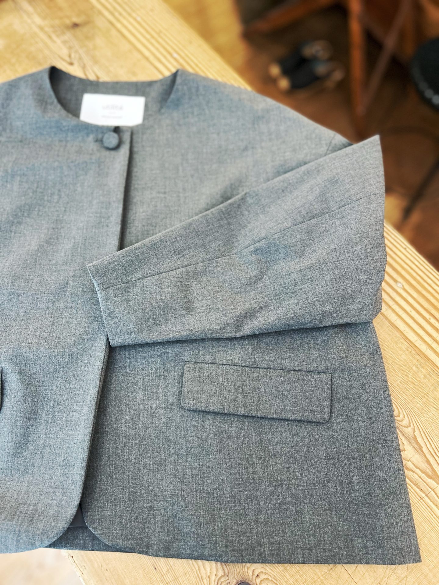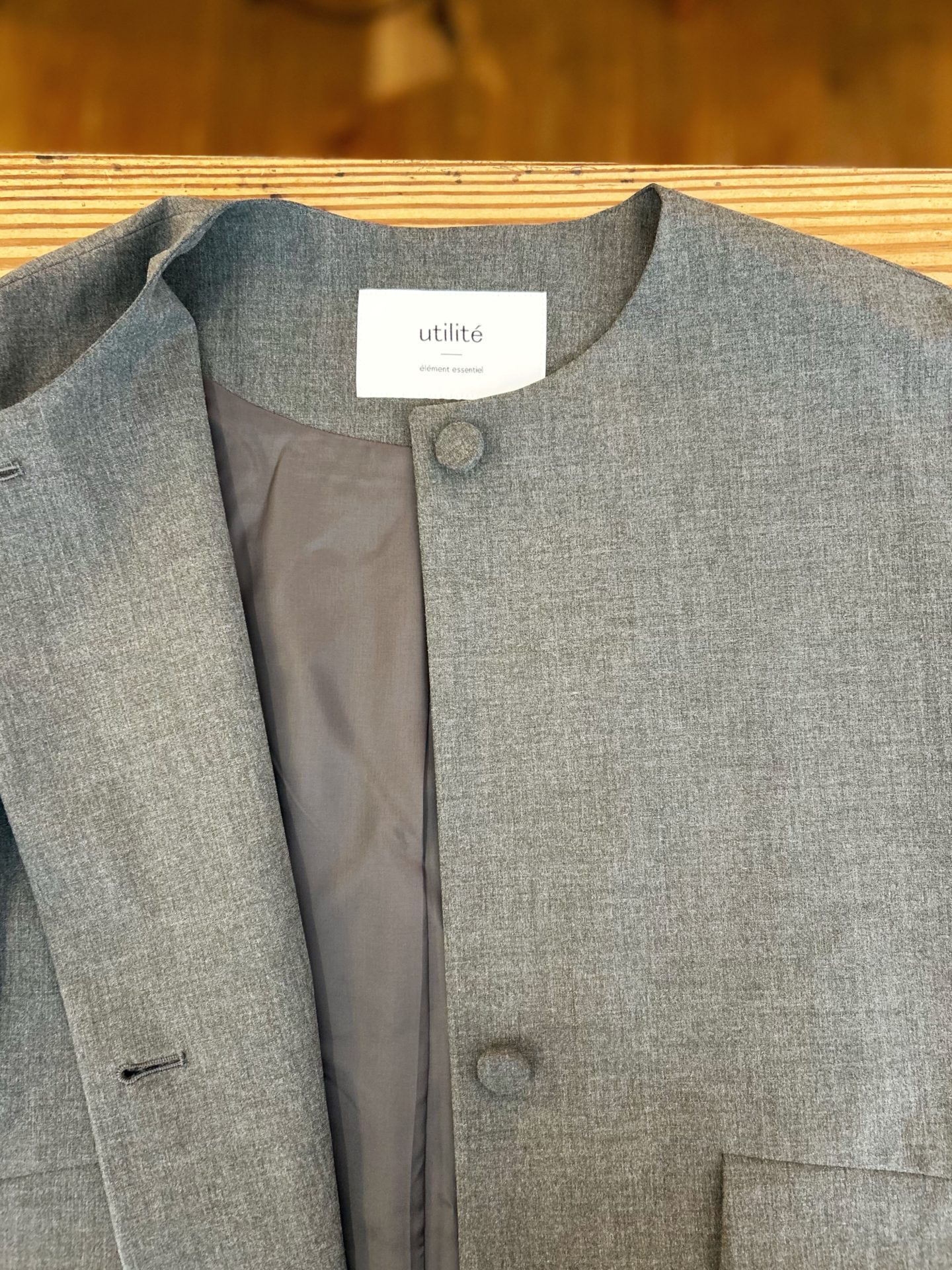 Bico Utilite ノーカラージャケット クロ・ミディアムグレー シンプルなノーカラージャケットです♪ やや肩の下がるドロップショルダーでゆとりのあるデザインです☆ ポリエステル 65% レーヨン29% ポリウレタン6% 裏地…キュプラ100% 27,500yen 同素材のパンツ、スカートと合わせてセットアップも楽しめます♪ 同素材のスカートやワンピース、パンツと組み合わせてお気に入りのセットアップスタイルをお楽しみください。 2025-08-22 by chabbit utilite < Utilite Utilite >