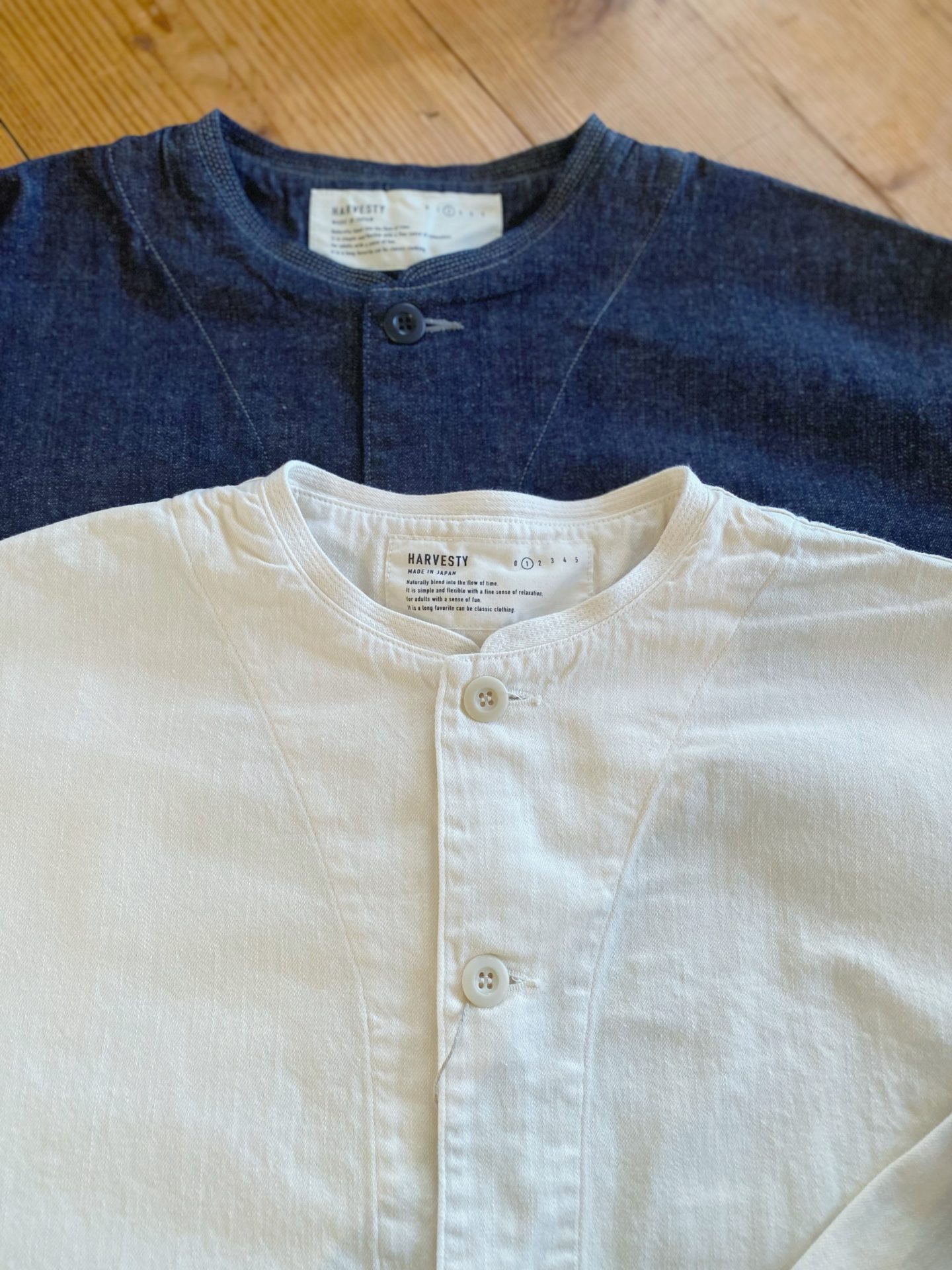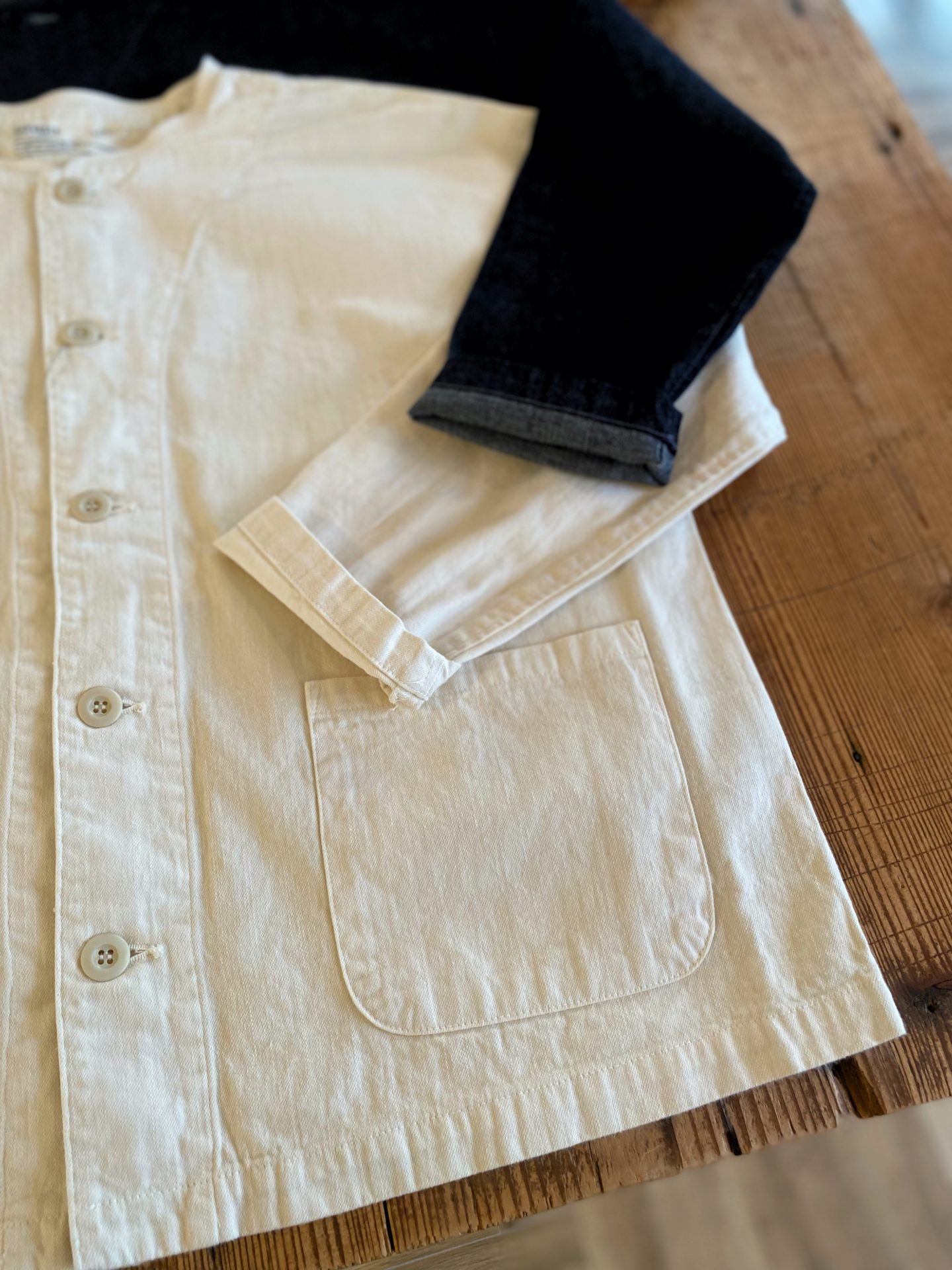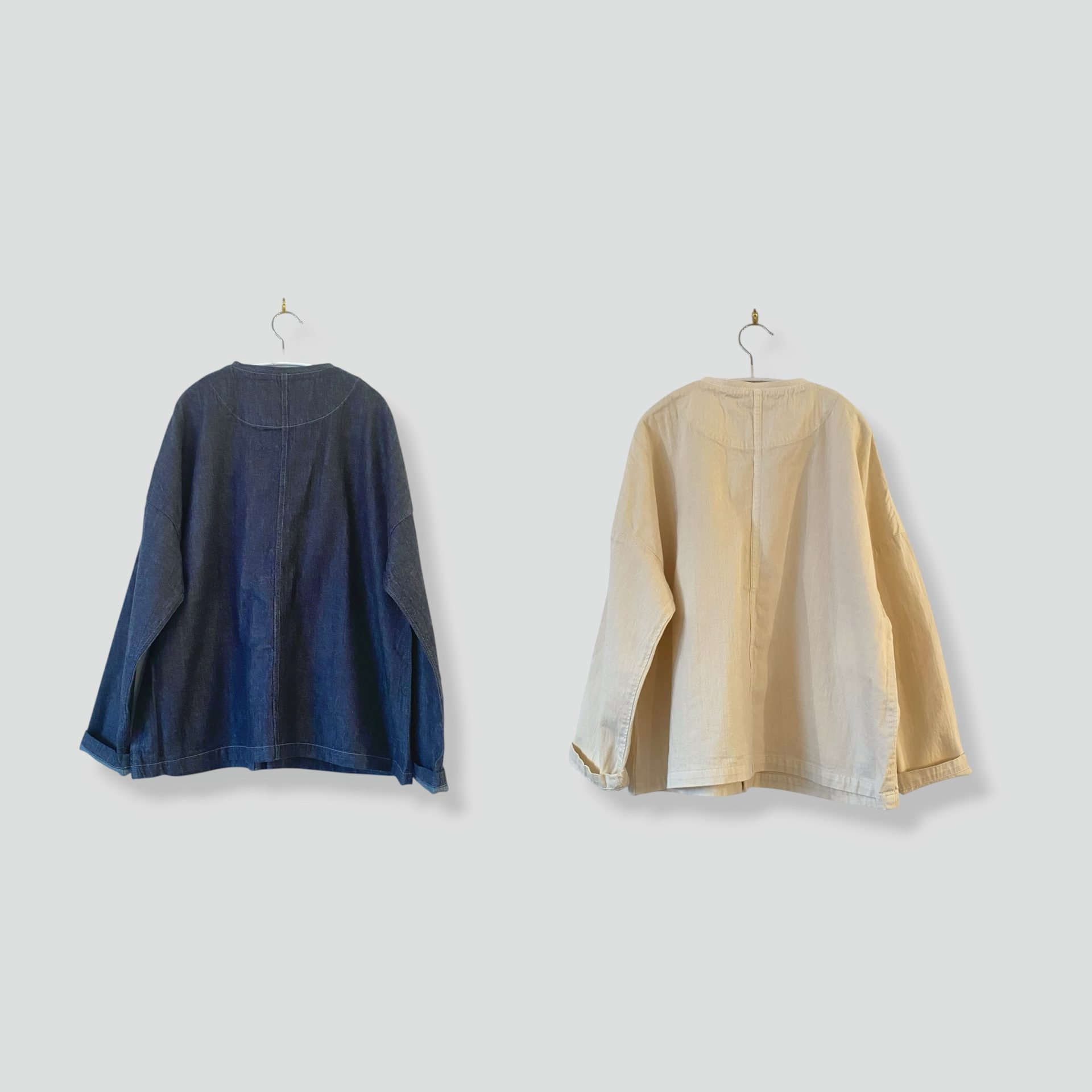 薄手のデニム素材で、洗いざらした風合いが柔らかい雰囲気を出しています。 ゆったりしたオーバーサイズのジャケットです。