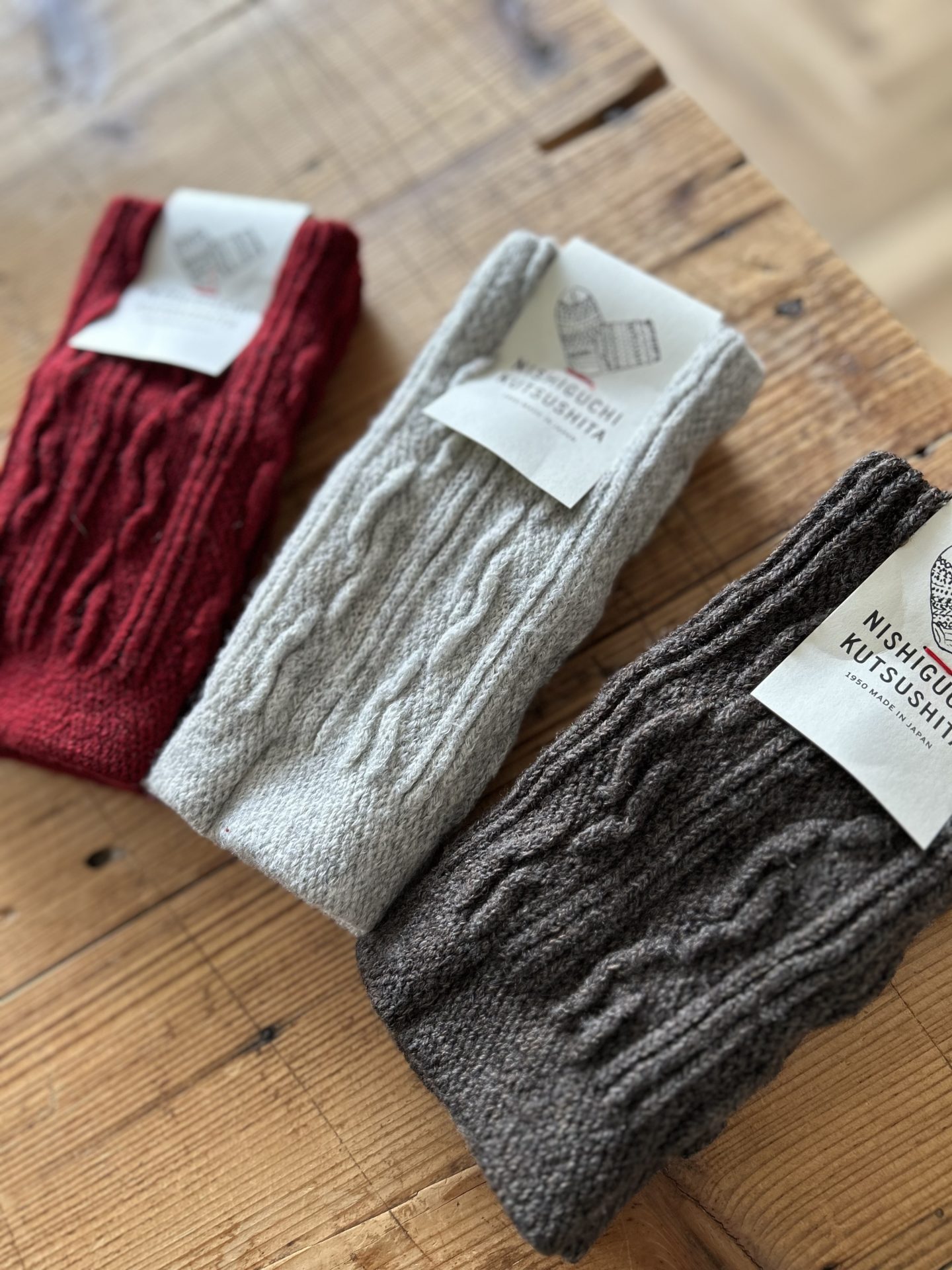Bico NISHIGUCHI KUTSUSHITA ウール縄柄ハンドウォーマー ギフトに人気のハンドウォーマー、久しぶりに入荷しました♪ ブラウン・ボルドー・ライトグレー 2,200yen 2025-12-22 by chabbit NISHIGUCHI KUTSUSHITA < ESTROISLOSE OLDMAN’S TAILOR >