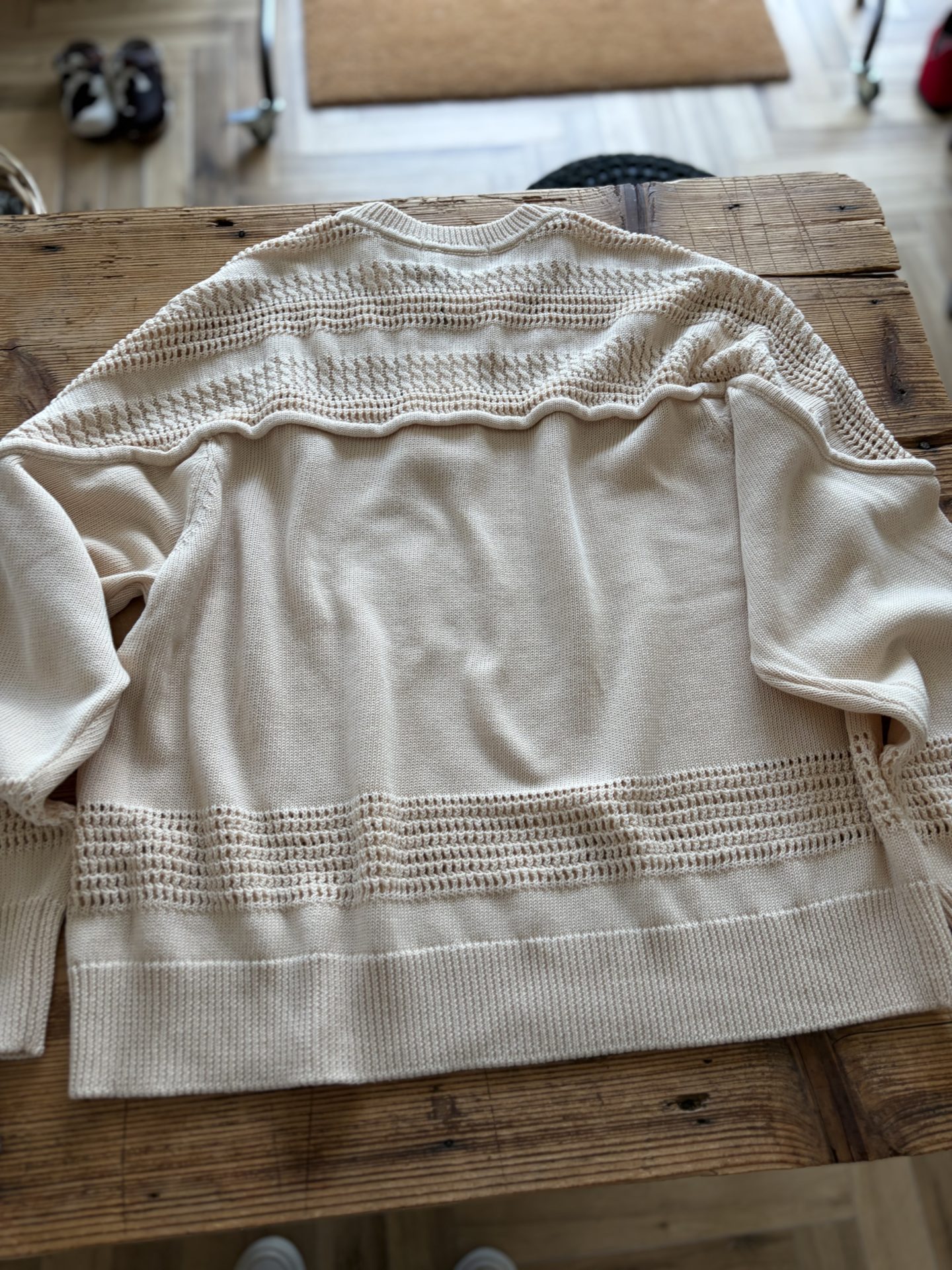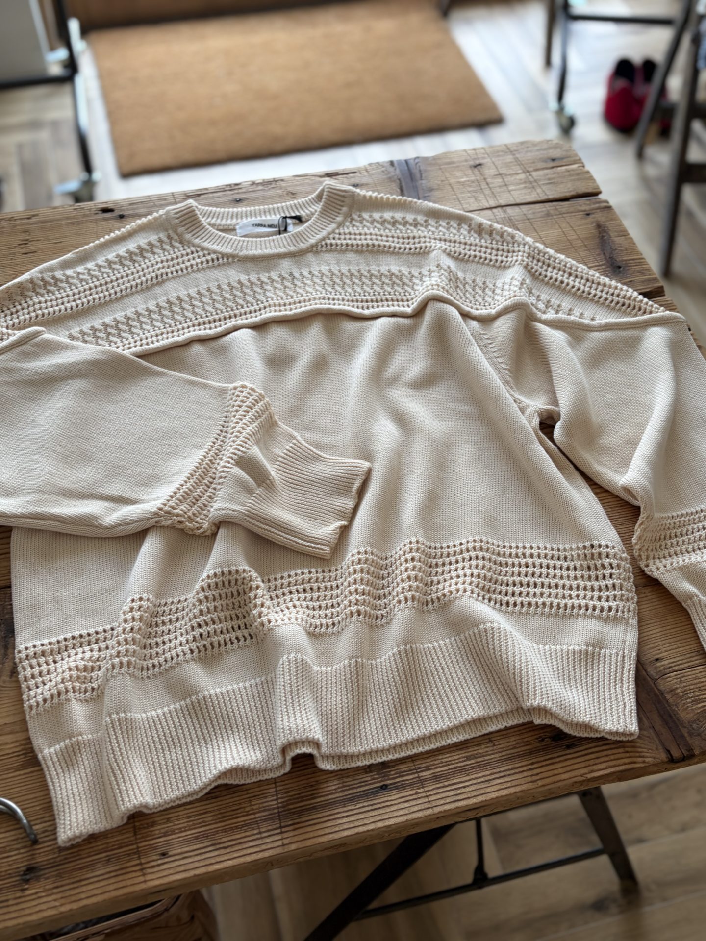 ハイツイストコットンの編み地を組み合わせた印象的な春ニットが入荷しました♪