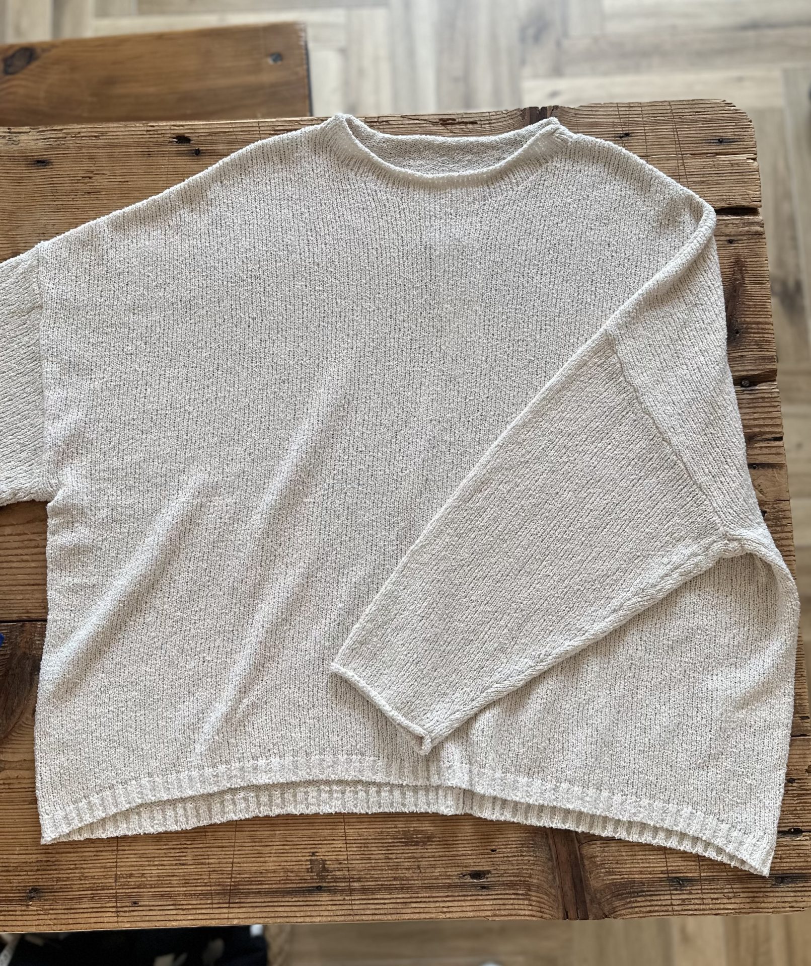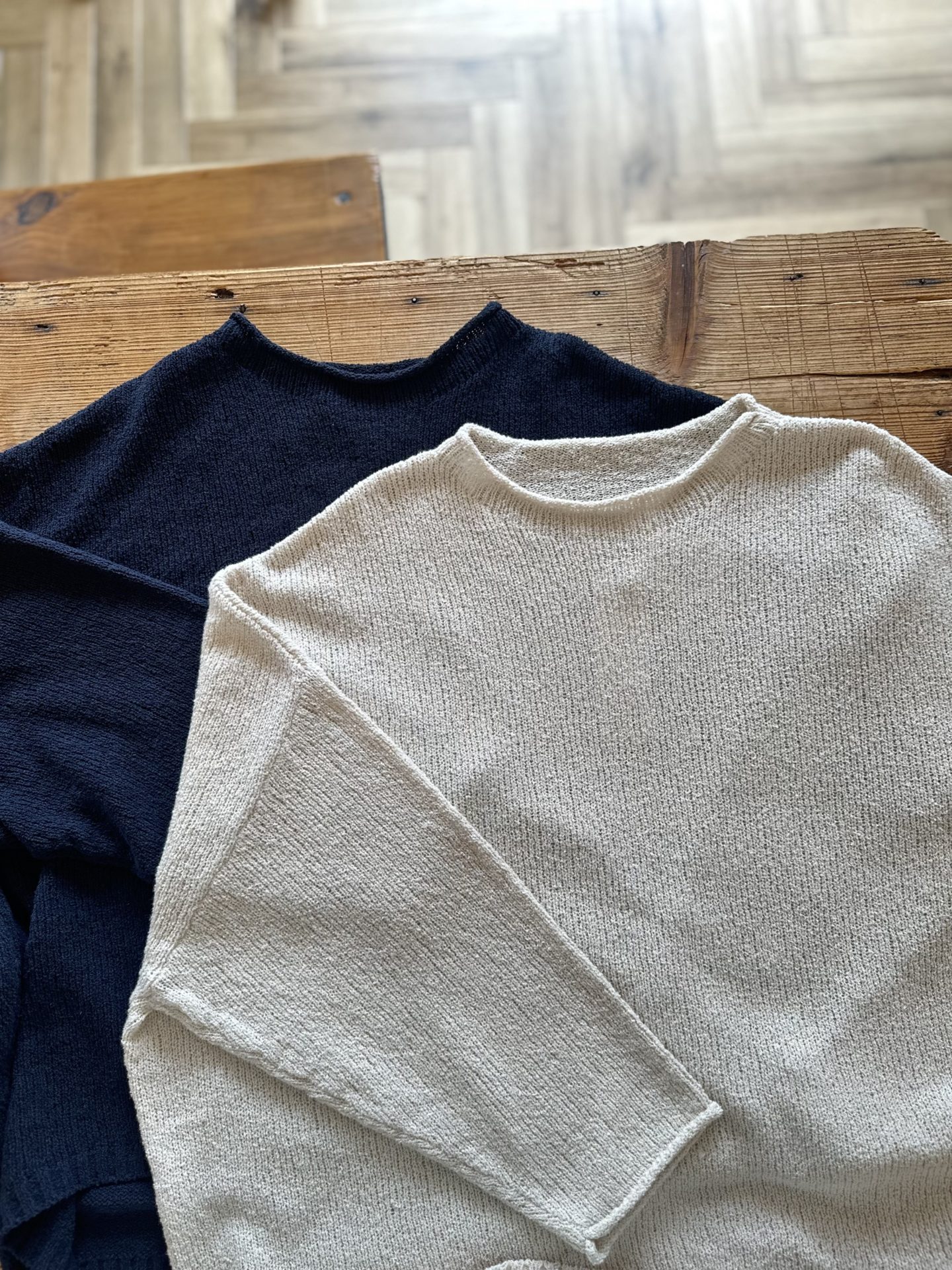 Bico grin コットンプルオーバー ディープネイビー・アンティークオフ 天然素材のコットンにナイロンを混紡した糸で使用した春らしい肌触りのプルオーバーです♪ 綿 85% ナイロン 15% 15,400yen 2026-02-14 by chabbit grin < POUTO harmonie >