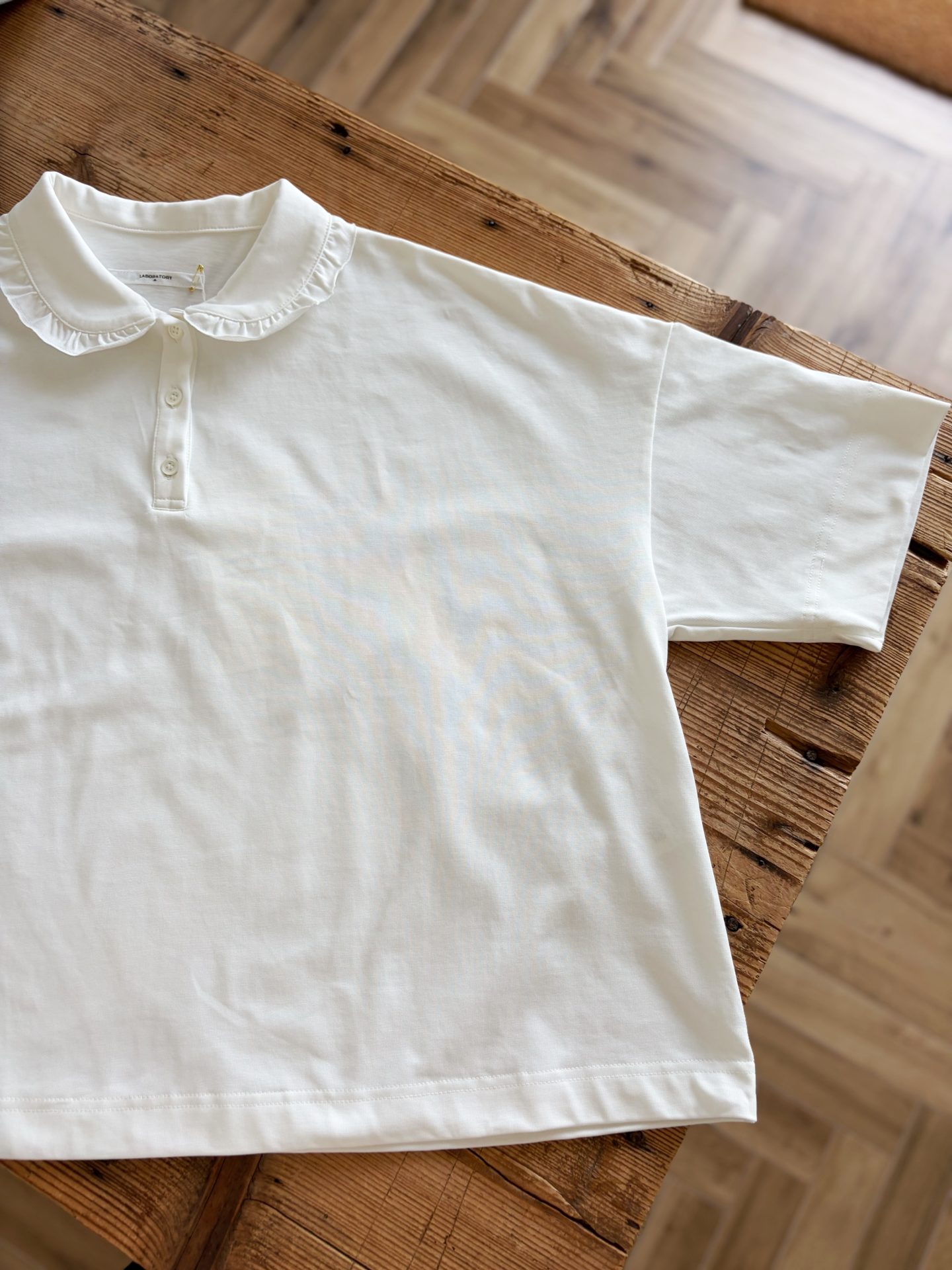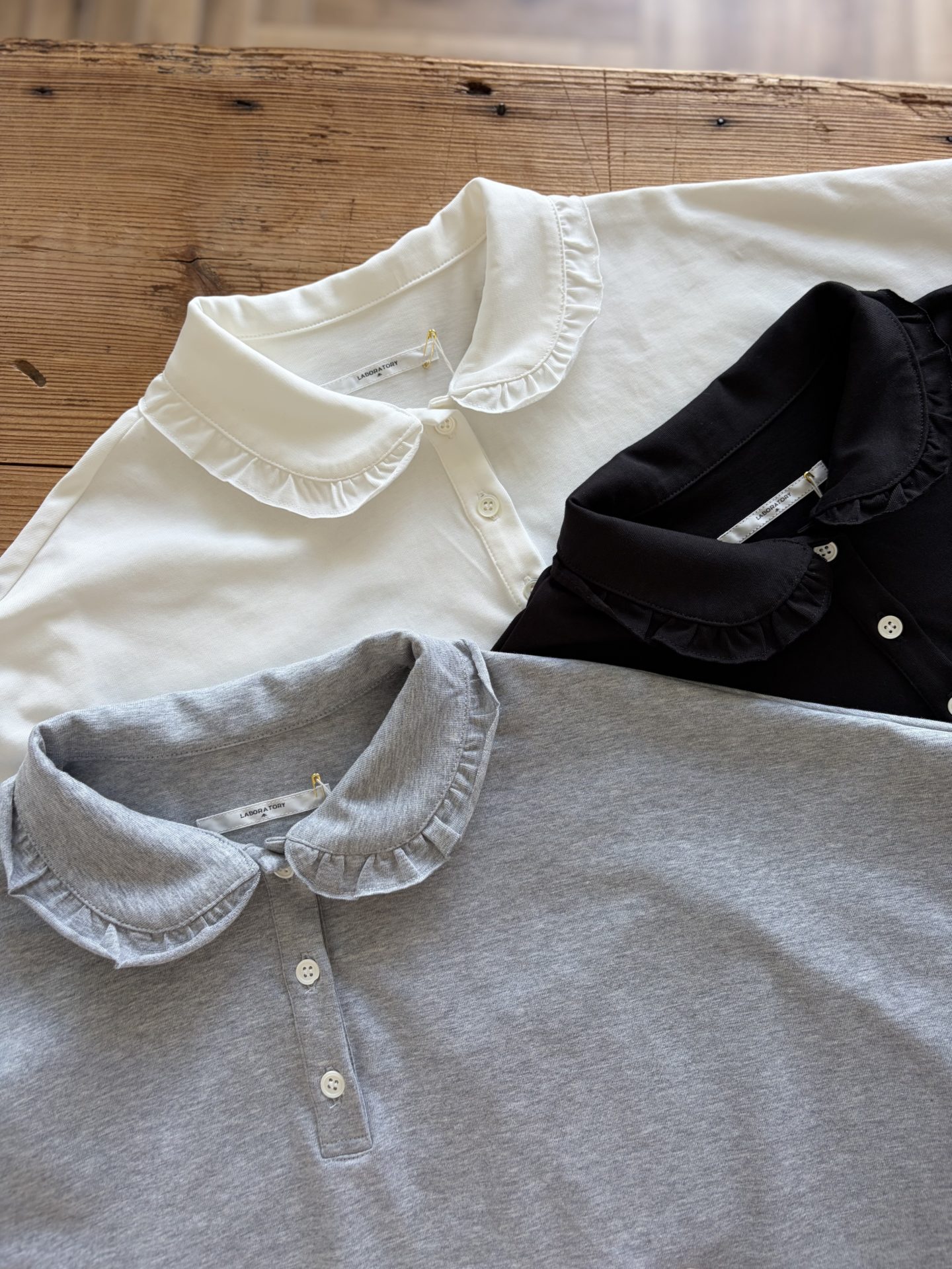 小ぶりなフリル襟と前立てデザインがポイントの 甘くなりすぎず、大人のプルオーバーです♪