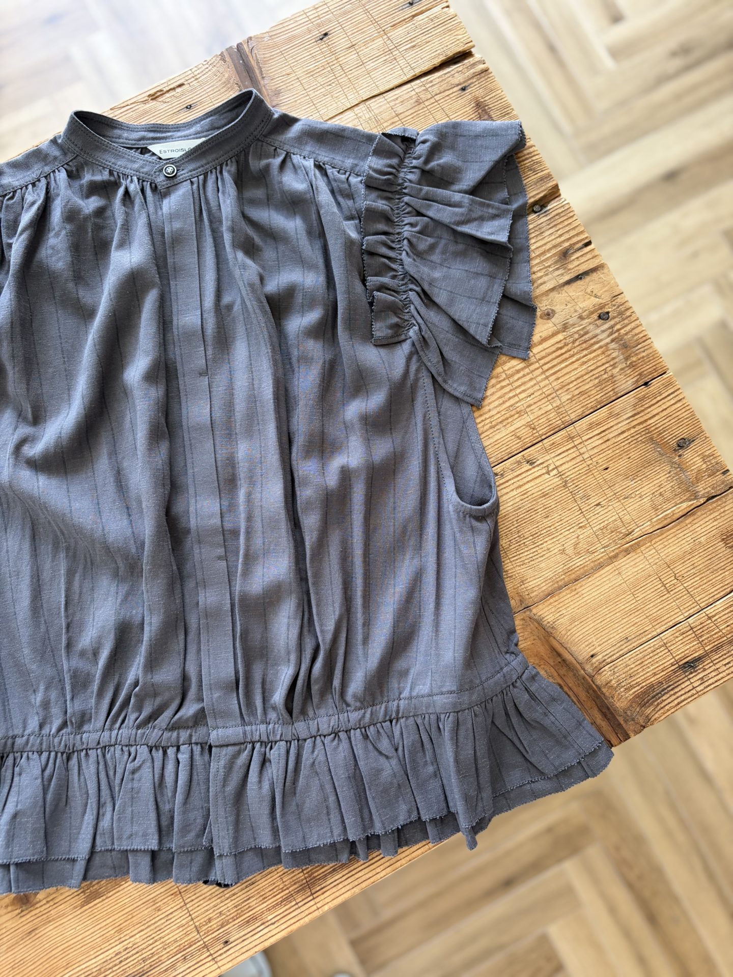 大きくあいたアームホールと肩口のボリューム感のあるフリルと、肩と裾にあしらわれたペプラム調のフリルが特徴です♪