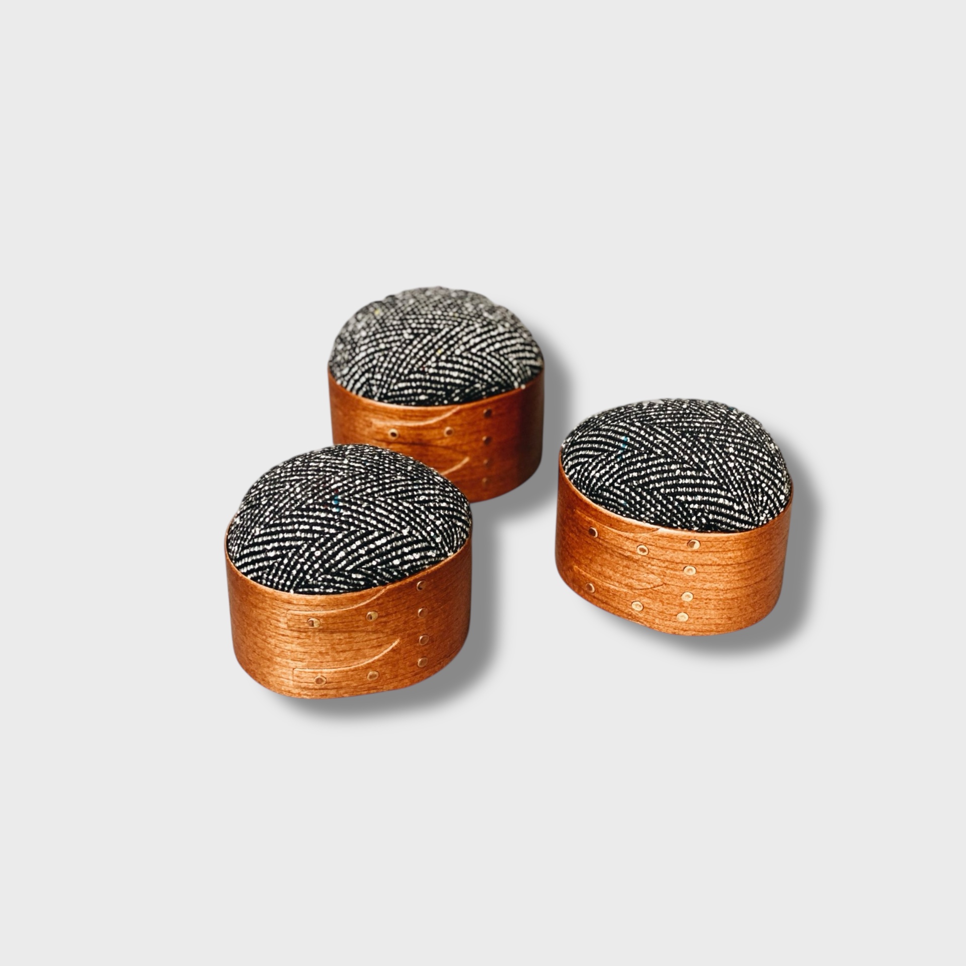 シェーカーの木の暖かさと素材となっているチェリー材の色に合わせてセレクトしたファブリックのピンクッションは、日常の作業をちょっだけ楽しい時間にしてくれそうです。