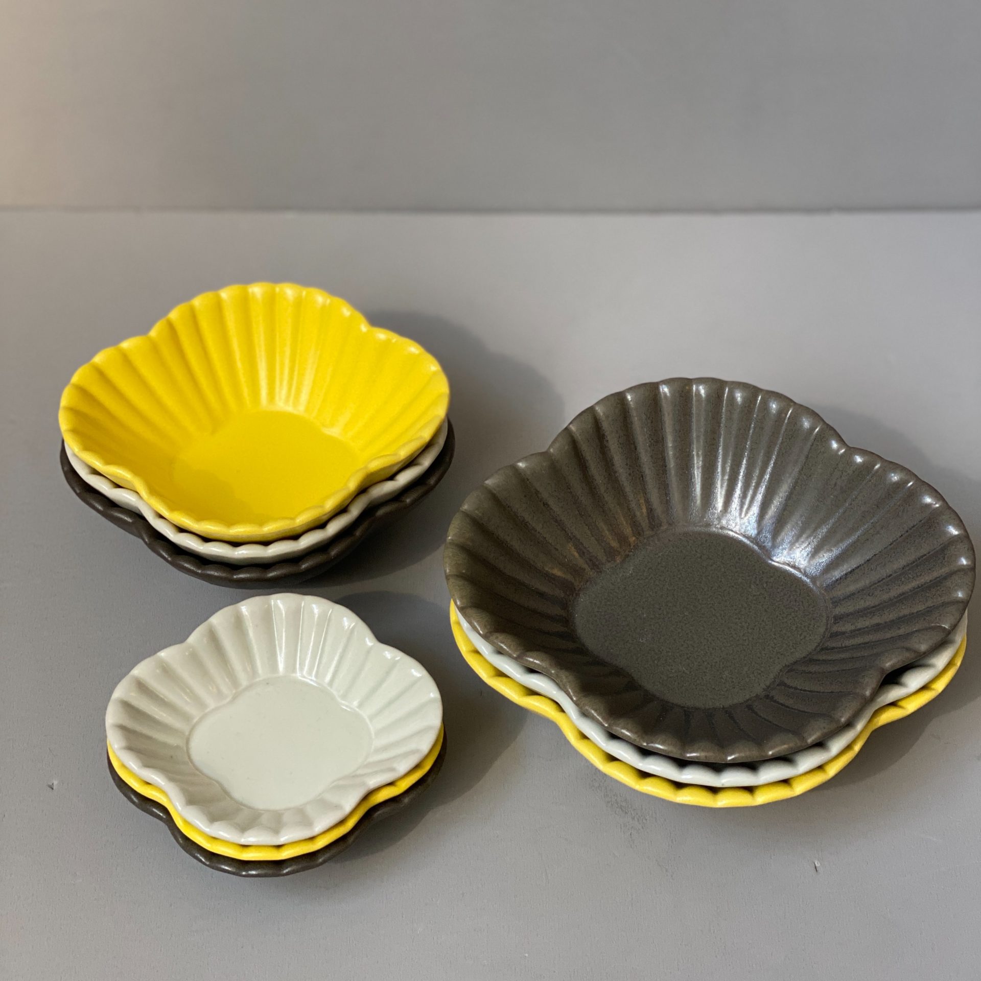 木瓜と菊割を組み合わせた、華やかな小鉢・豆皿のシリーズ。ぷくっとふくらんだ細かい菊割がやさしく上品な印象です。4.5寸鉢は煮物や炒め物にぴったり。磁器素材で扱いやすいのも嬉しいポイント。上品な青白、落ち着きのある墨、差し色になる黄の3色展開です。