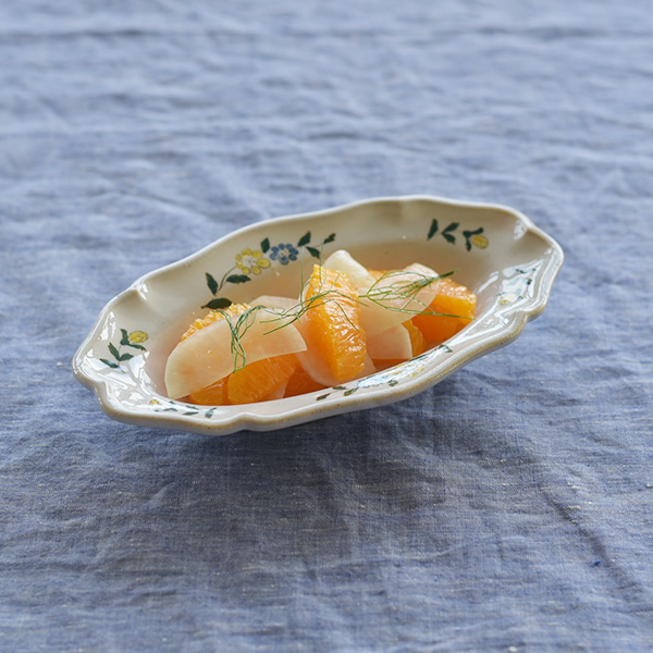 ひらひらした花型の形状と器の回りを舞うような絵柄はシンプルな料理を盛り付けても華やかさがあり、テーブルや空間が明るくなります。