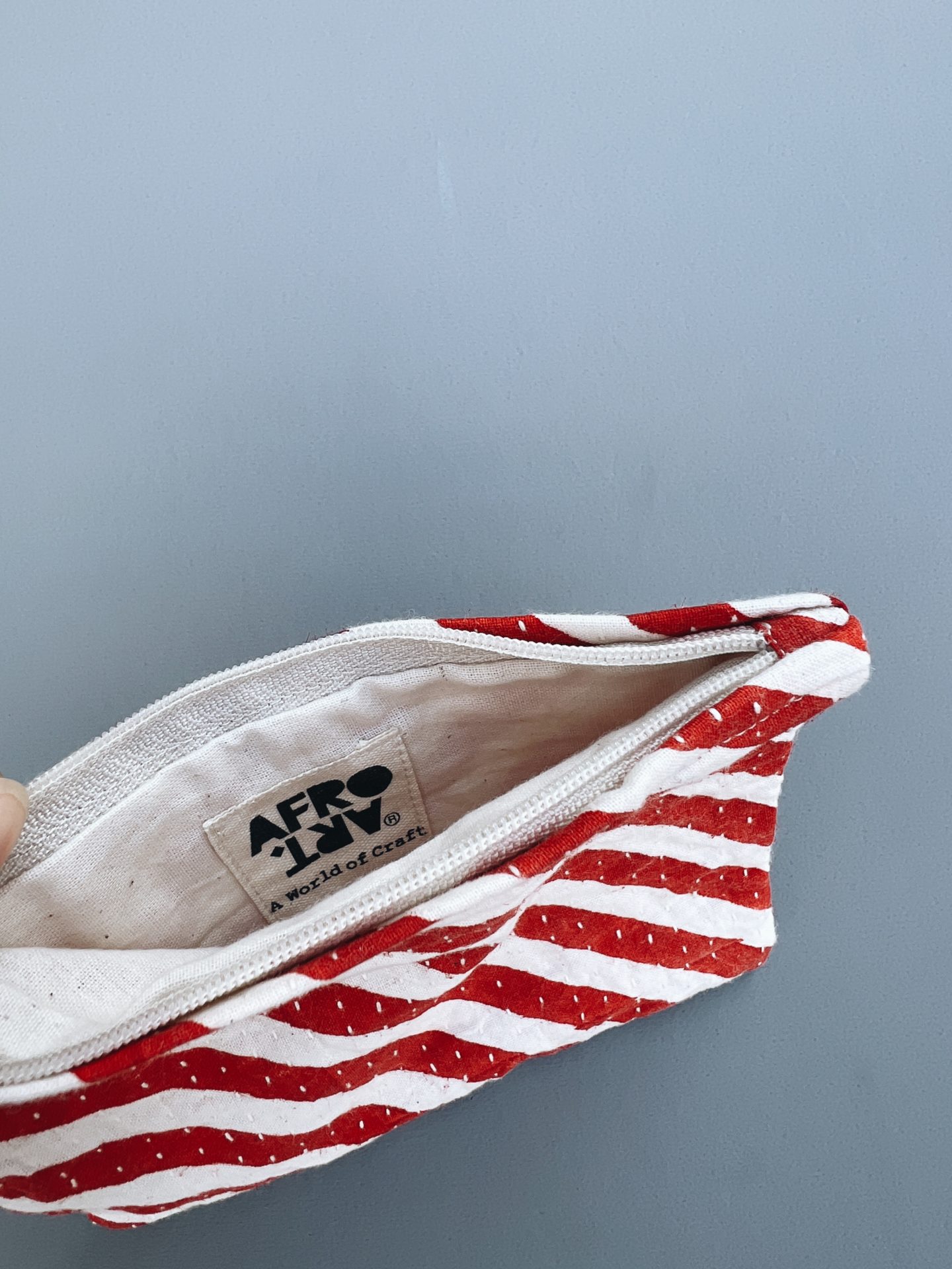 ポーチには、刺し子風ステッチが施され ひと針ひと針のあたたかみが