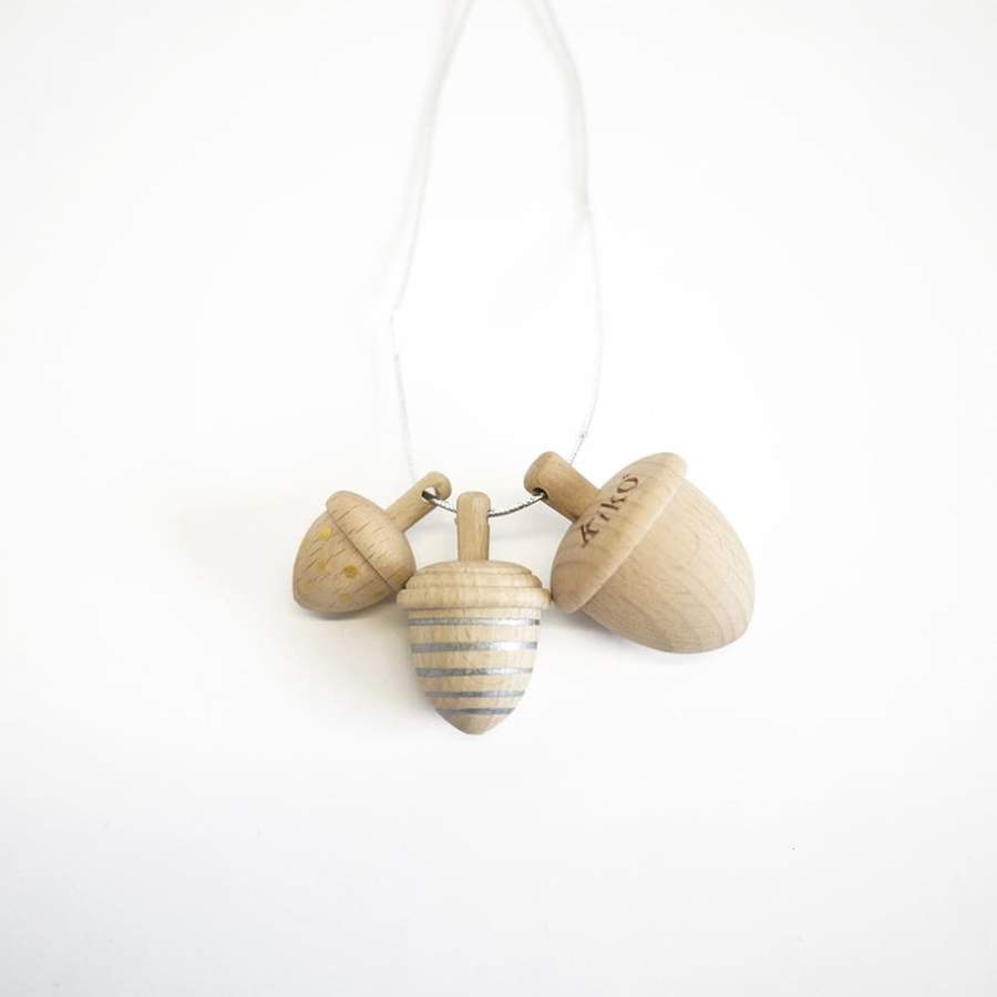 クルクルとまわして遊ぶコマ遊びのほか、ヘタに空いている穴に付属のシルバーのヒモを通せばネックレスにも。