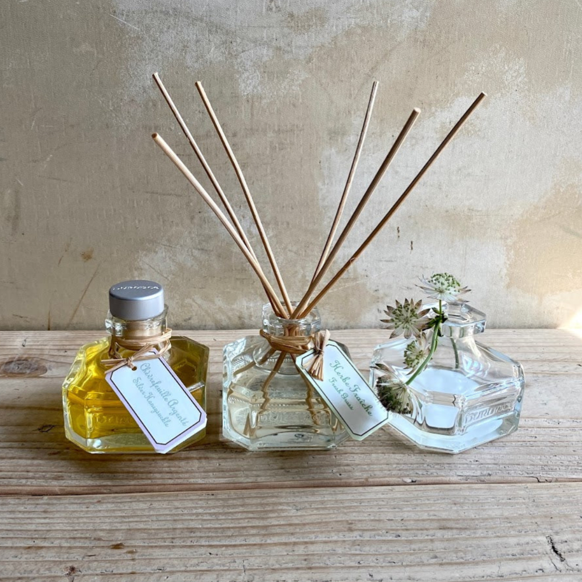 chabbit フレグランスブーケ DURANCE フレグランスブーケ ホワイトティー 再入荷 フレグランスブーケはヨーロッパでは幅広く愛用されている室内用芳香剤です。 スティックを差し込めば、染込んだグラース産の上品な香りがやさしく広がります。 玄関やお部屋に置くとインテリアとしても素敵です。 本体(100ml+スティック)…4950yen リフィル(250ml)…4400yen 2025-12-17 by chabbit chabbit fragrance interior < 高台付き豆皿 飾り棚 >