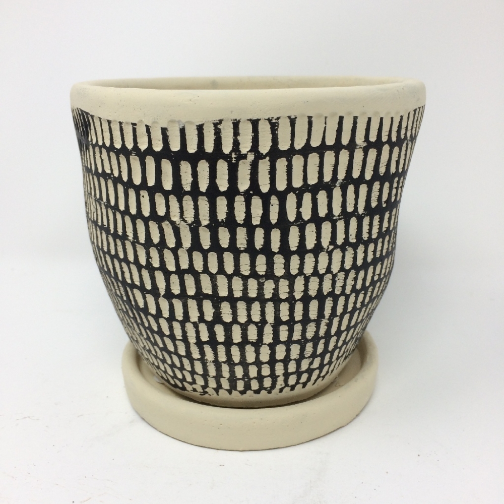 カジュアルヴィンテージなテイストにも合わせやすい、デザイン性の高いポット。少しいびつな形と、手彫りで彫ったような柄の上に、更にペイントを施した、手のこんだ作り。穴ありで皿が付いているので、室内のインテリアにもマッチ。サボテンや多肉も似合います。