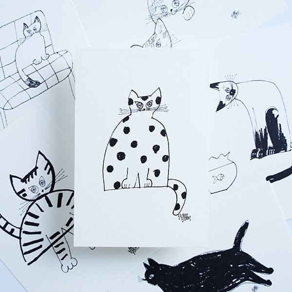 yamyamが描く猫たちが自由に動き回る様子がポストカードに。