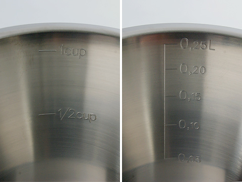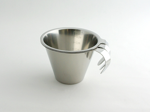 良質な鉄鉱石が採れるスウェーデンで、ステンレス製キッチン用品を長年にわたり製造してきたヨナス。近年は家庭用のアイテムも充実していますが、もともとは業務用品をつくるメーカーでした。現在もスウェーデン国内でほとんどの製品を製造し、北欧の洗練されたデザインと質実剛健な機能性を持つヨナスの製品は、アメリカやヨーロッパ各国でもたいへん高く評価されています。この計量カップは、ヨナスの計量カップの中では一番小さくてかわいらしいのですが、目盛りはデシリットル表記のみです。1dl は 100 ml。普段あまりなじみのない単位で、洋書にやたらと出てくる印象のデシリットルですが、専用のカップがひとつあると便利かも知れません。また、ハンドルの下部が本体とつながっていないオープンハンドルなので、スタッキングして収納することができます。