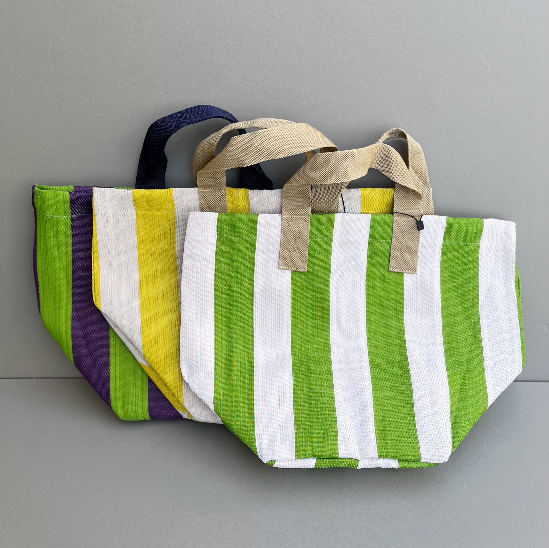 ポリエステル素材のカラフルなストライプ生地が目を引くインド製のトートバッグです。