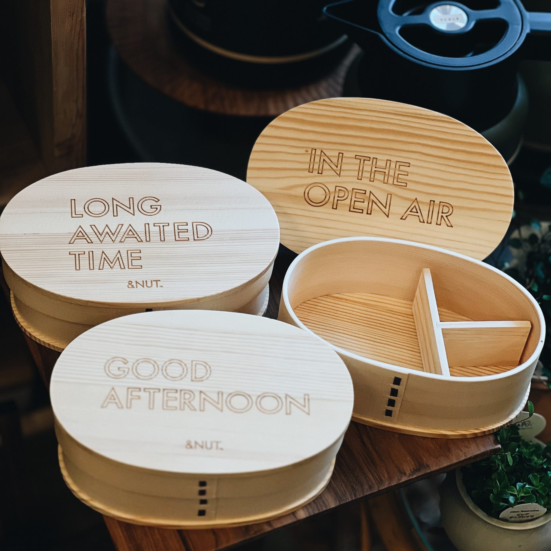 杉の木のにおいが食欲をより一層かき立てる木製のわっぱ弁当箱にミニマルなロゴをあしらってあります。
