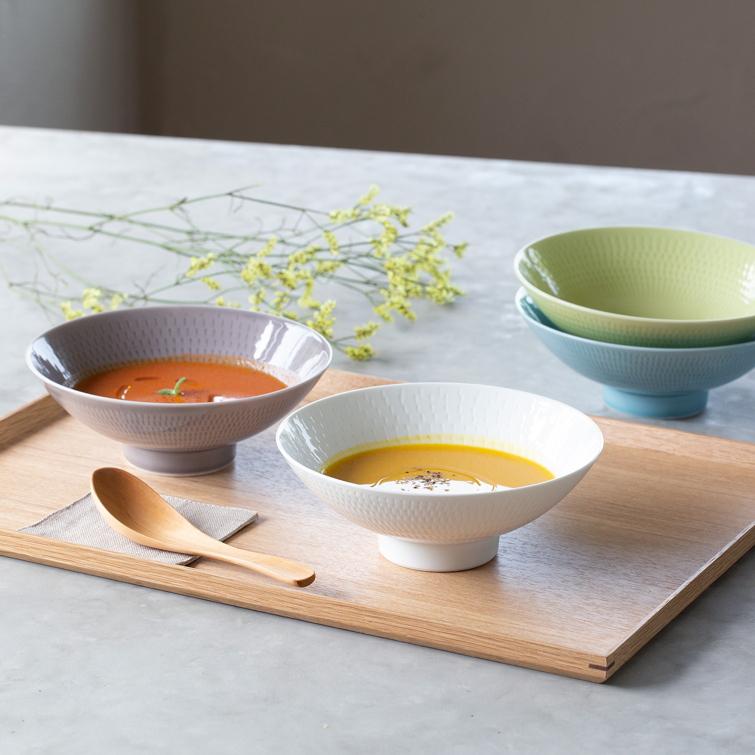 chabbit 平碗 平碗(波佐見焼) 素焼前の生地を熟練の技術によって削り出した繊細な紋様は美しく、茶菓子や料理をさりげなく引き立たせてくれます。 また、彫りの圧によって紋様が一つひとつ微妙に異なるのも、手仕事ならではです。 サイズは小(φ12×H4.5cm)、中(φ14×H5cm)の2サイズ。 カラーは桔梗の入荷です。 食洗機、電子レンジ使用可能です。 小…1540yen 中…1870yen 2023-12-12 by chabbit chabbit kitchen < 豆皿 瓢 haku碗 >
