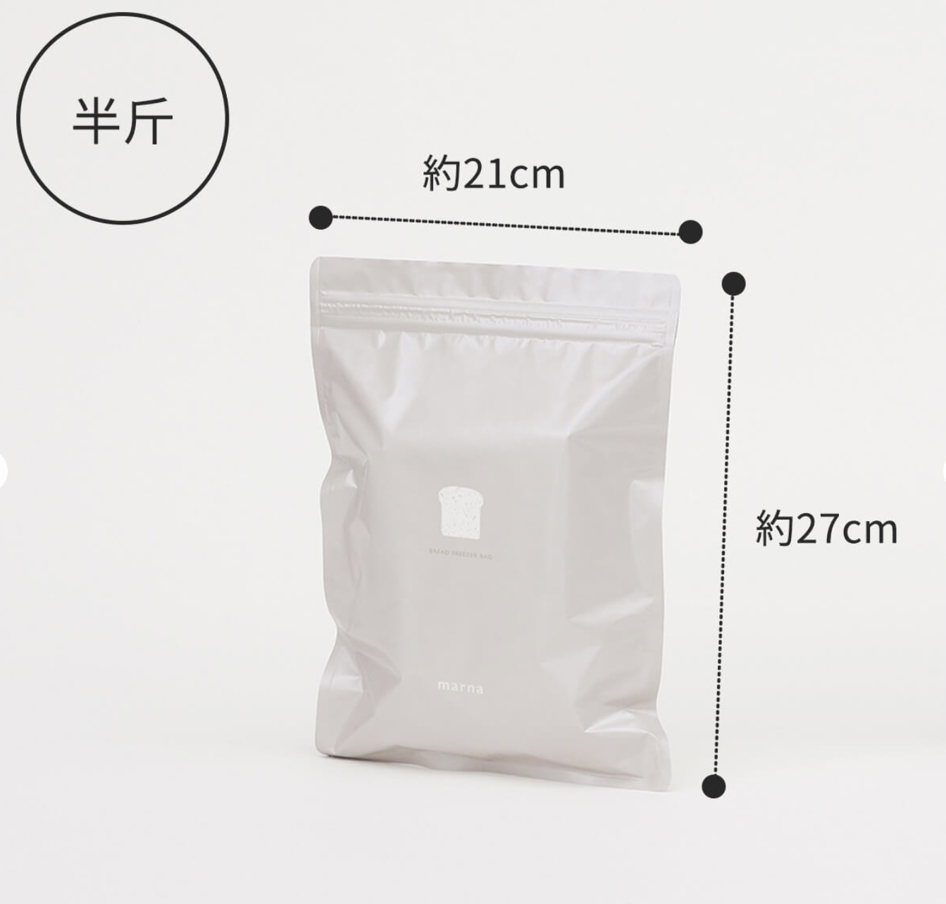 5・6枚切角食パンが3枚程度、4枚切角食パン・山型パンが2枚程度入る「半斤」サイズです。