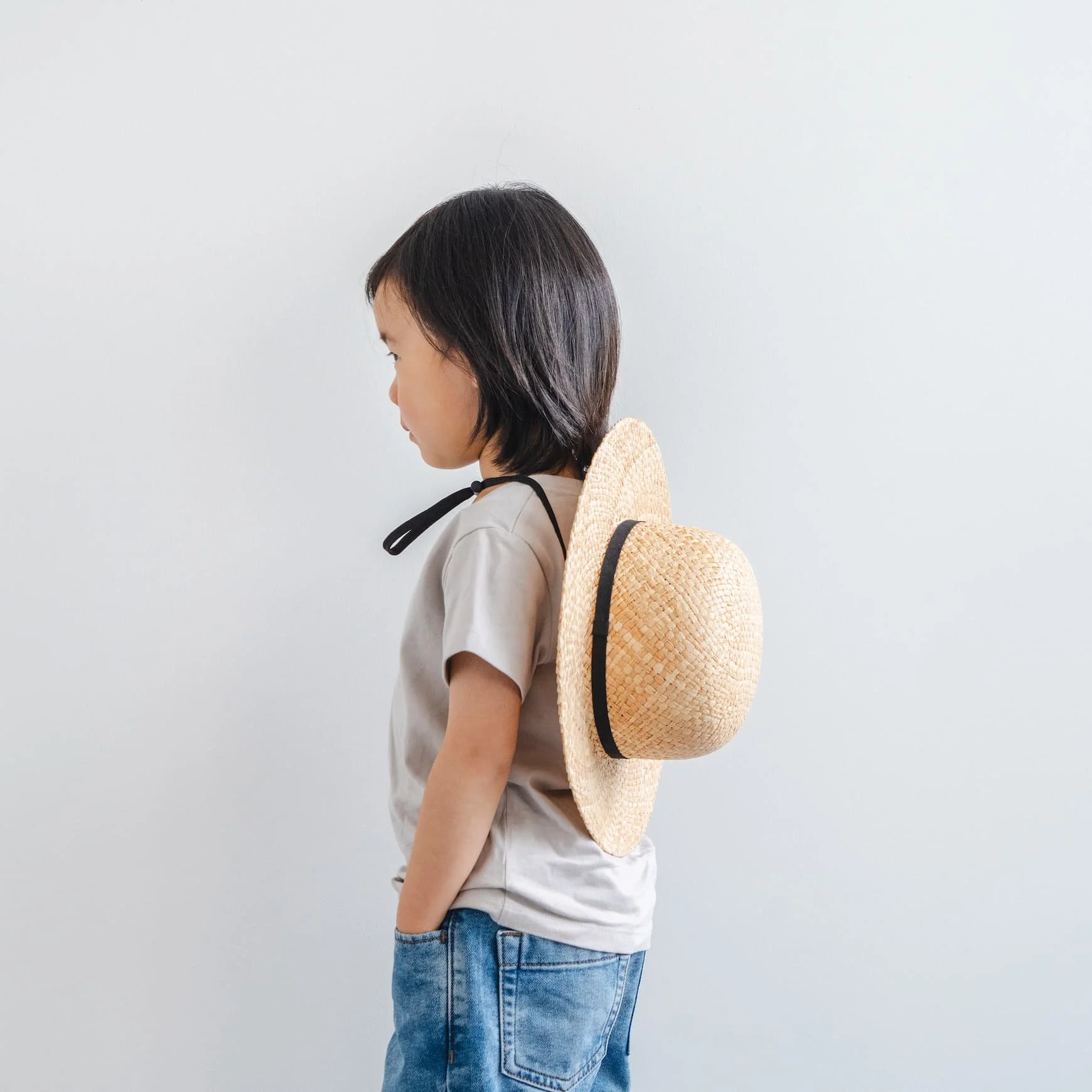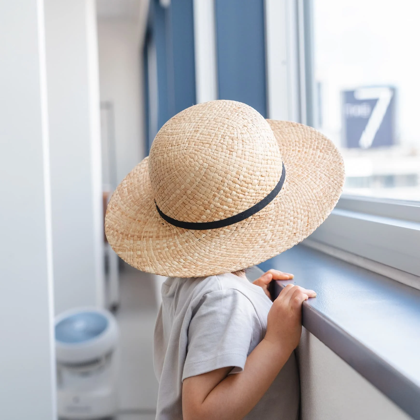 しっかりと日よけをしてくれる長いツバと、黒いリボンがデザインのアクセントに。