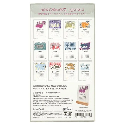 chabbit 卓上カレンダー ミロコマチコ卓上カレンダー 活版印刷と木製スタンドを組み合わせた、あたたかみを感じられるカレンダーです。 画家・絵本作家 ミロコマチコのアート毎月変わるカラーが楽しいデザイン。 オリジナルのボックスに入っており、プレゼントにもおすすめです。 「アニマルファミリー」をテーマに12ヶ月描き下ろされたカレンダーです。 サイズは175mm × 105mm × 22mm 1540yen 2024-09-07 by chabbit calendar chabbit stationery < 卓上カレンダー 卓上カレンダー >