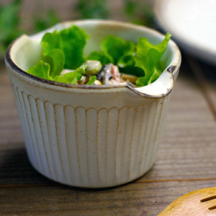 側面に伸びる細いラインとふちの錆びのラインが印象的なかわいいココットです。
