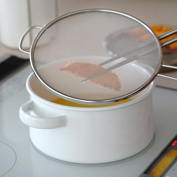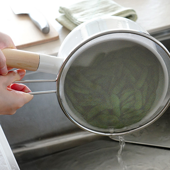 細かい編み目の「30メッシュ」なので、揚げものなどの油はねもしっかり抑えます(直径19㎝以下の鍋まで)。持ち手が付いているので吊るして収納もできます。