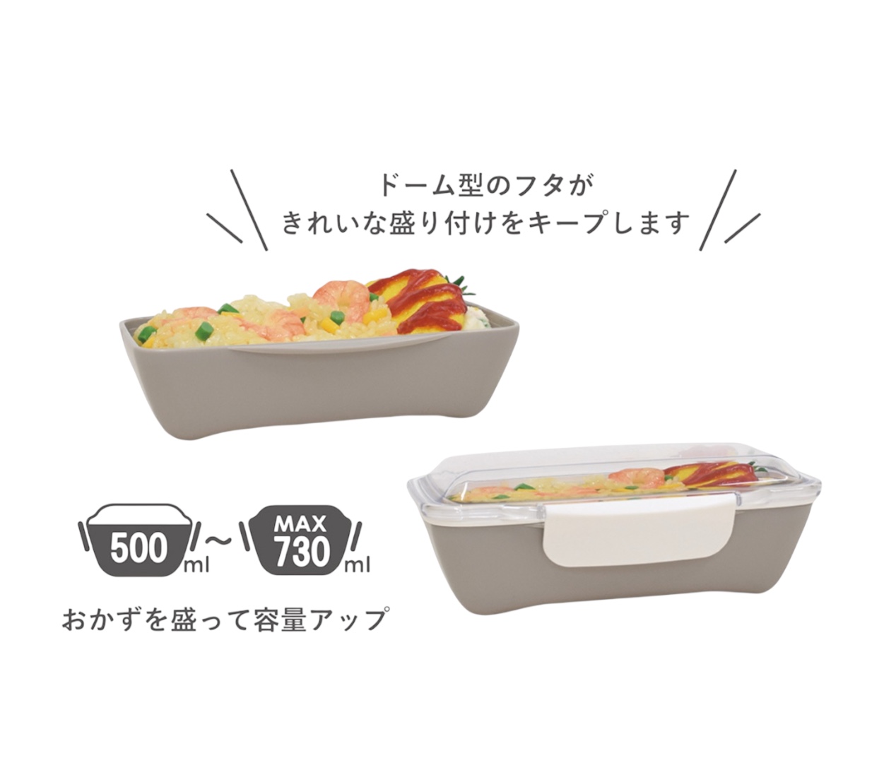 ドーム型のフタが盛り付けたおかずをつぶさず、きれいに保ちます。