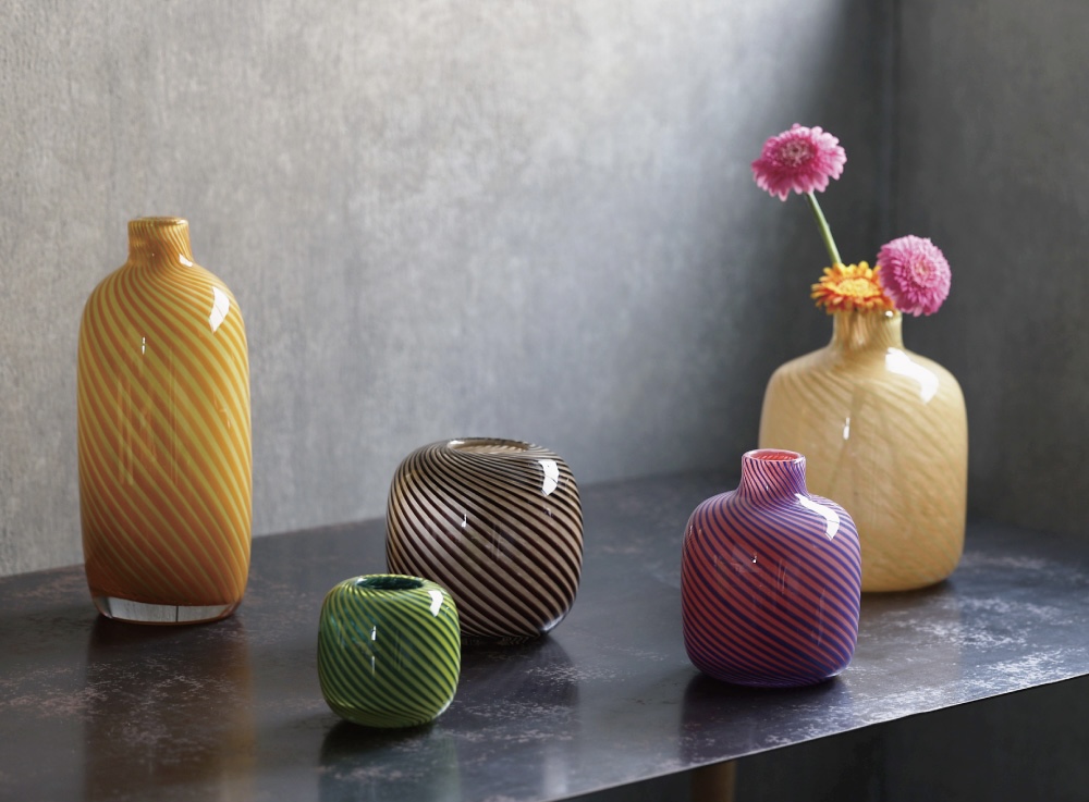 キャンディーのように艶やかで甘い色彩のガラスに、ぼやけすぎないようにストライプで引き締めた重厚感のあるガラスの花器です。