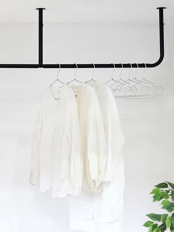 「シーリングパイプハンガー 1550」は、横幅が約155cmの大きめサイズ。約4段階の高さ調整機能付きで、天井から最短で約36cm〜最長51cmまで高さ変更が可能となります。使う方の身長や天井高に合わせて調節をしてください。