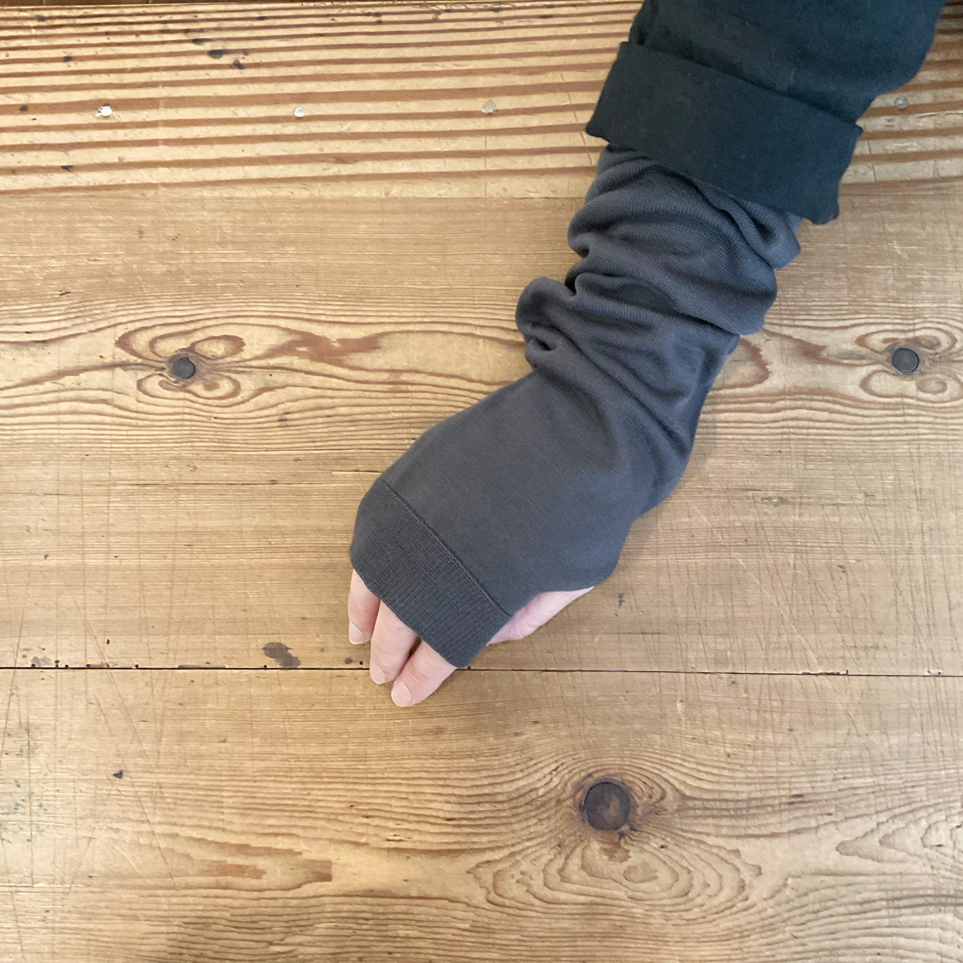 親指を通す穴は無縫製でやさしい肌あたり。皮膚や環境への安全性に配慮された天然有機系の抗菌防臭加工を施しています。