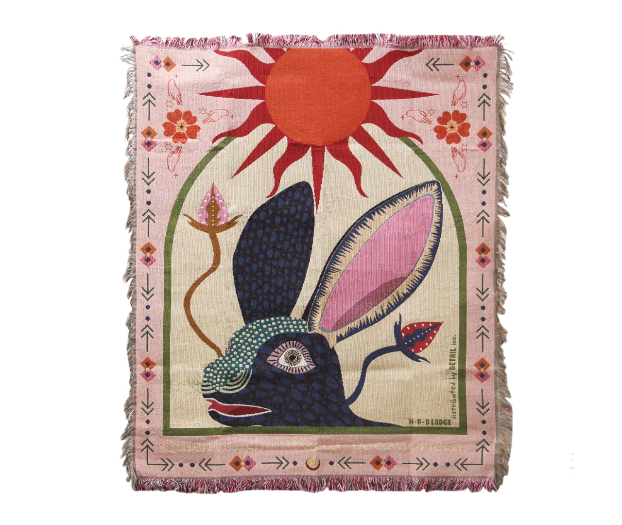 光り輝くメキシコの太陽のもと自由に飛び回るウサギを表現しました。”Quien mucho abarca, poco aprieta(二兎を追う者は一兎をも得ず)”と、外から窓越しに存在感放つ一兎があなたを眺めているデザイン。素材は、ポリエステルの耐久性とコットンの通気性の両方を特性を備えたポリエステルコットン生地。少し厚みがありながらも艶感があり、触り心地の良い通年ご使用いただける生地感です。